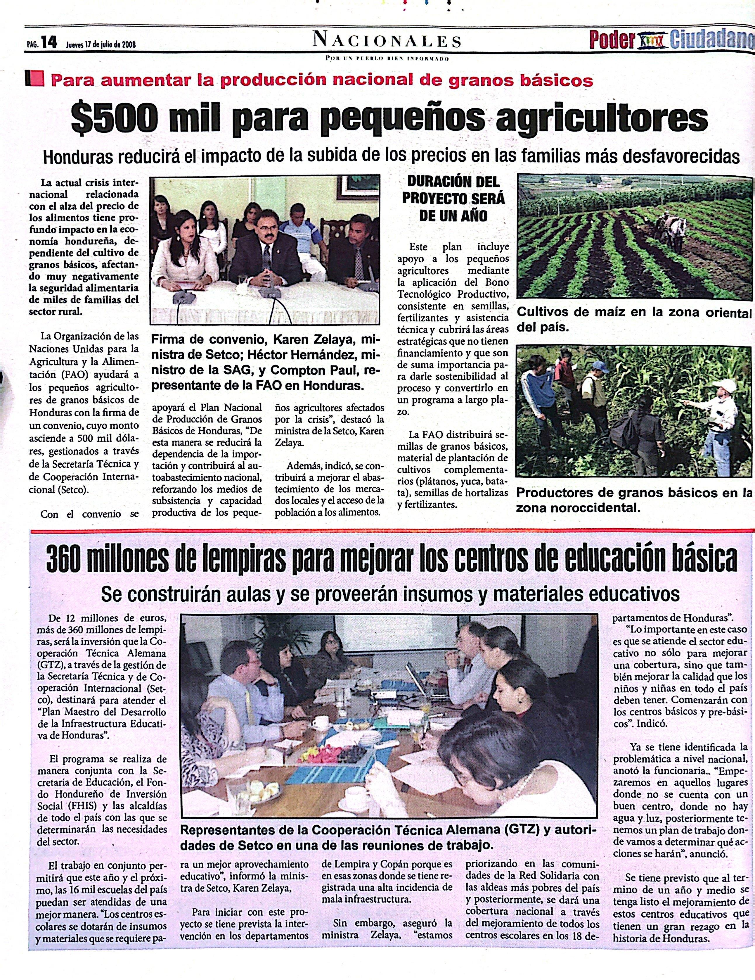 Honduras recibe 60 millones de dólares del BCIE para seguridad alimentaria. P. 01