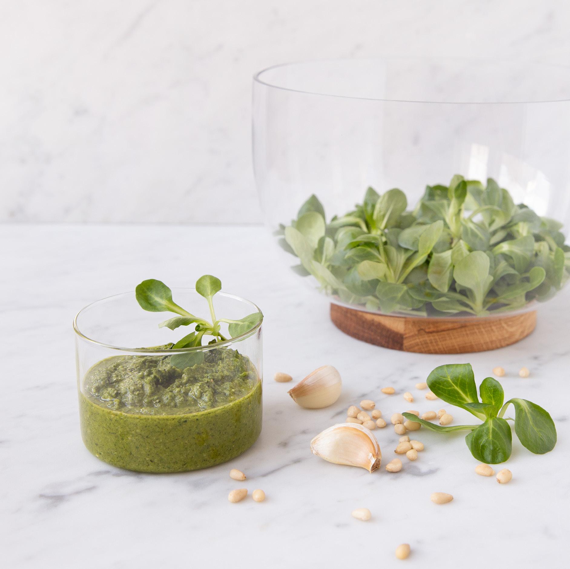 Aloita valmistamalla pesto. Kuori ja murskaa valkosipulinkynsi.