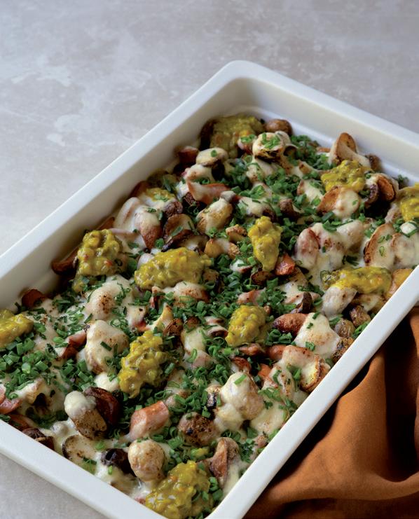 Öljyssä timjamin kanssa paadetut varhaisperunat ja napsahtavat Patunakit saavat päälleen herkullisen juustogratiinin ja kylkeen sinappikurkkusalaattia pyttipannun tyyliin.