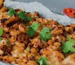 1. Punnitse soijarouhe GN-vuokaan ja kaada päälle kiehuva/ kuuma vesi. Anna tekeytyä muutaman minuutin ajan. Lisää makaronit, sipuli ja tomaattimurska, sekoita.