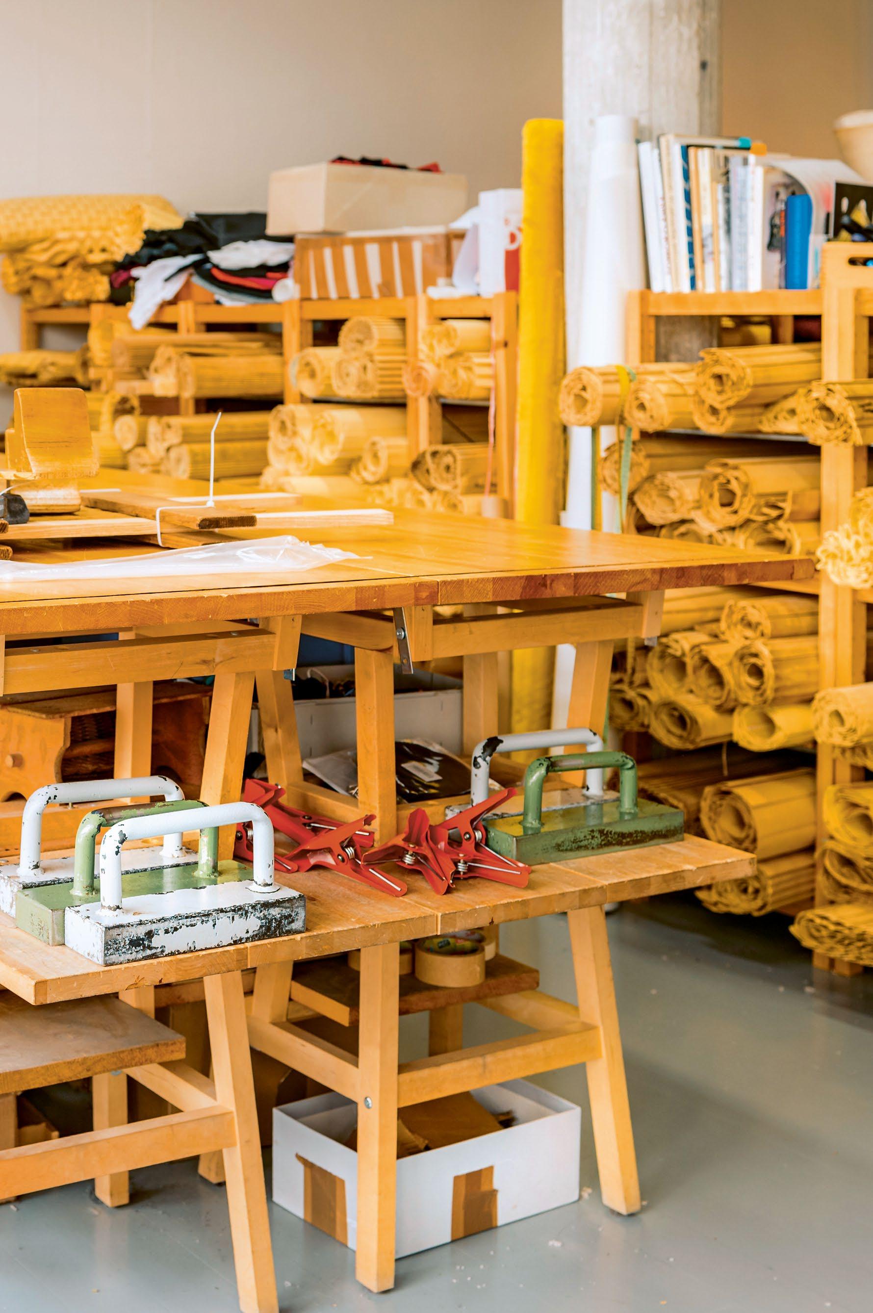 Papierli herum. «Oft geht die Idee von etwas aus, das ich sehe. In Origami-Büchern zum Beispiel. Dann mache ich kleine Musterfaltungen und am Ende zeichne ich die Faltung in einem Vektorprogramm und lasse sie auf einem Plotter rillen, um gut faltbare Druckstellen zu bekommen.» Die Schablone wird schliesslich aus einem speziellen, hitze- und feuchtigkeitsbeständigen Karton von Hand gefaltet. Sie besteht aus zwei Teilen, zwischen die am Ende der Stoff gelegt wird. Die zusammengefaltete und fixierte Form kommt danach zum Brennen in den Ofen. «Die Falten entstehen durch Druck, Feuchtigkeit und Hitze – und das anschliessende Abkühlen und Trocknen. Ein Prozess, der insgesamt etwa 12 Stunden dauert», erklärt Eva.