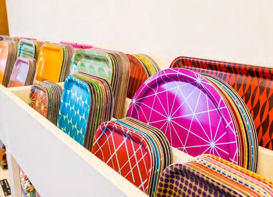 Da wären zuerst einmal die Geschichten rund um die Kollektionen, die von der Aktualität des Alltags, von Kunst, Wissenschaft und neuen Stilen inspiriert sind. Hinter jeder Kollektion verbirgt sich ein bestimmtes Thema, das auf den ersten Blick nicht immer ersichtlich ist, aber zu dem bekannten Aha-Effekt führt, sobald man die Hintergründe erfährt. «Ich brauche ein inhaltliches Thema, das mich zum grafischen Muster führt» so Textildesignerin Fabia Zindel, die Matrix im Jahr 1995 gegründet hat und für die Konzeption und Entwicklung der Designs, sowie deren Produktion zuständig ist. In ihrem Moodboard zum aktuellen Thema Salz geben zahlreiche Zeichnungen und Fotografien von Salzkristallen, Salzseen oder Salzhaufen einen Eindruck, nach welchen Vorlagen die geometrischen Muster entstanden sind. Verspielt und dezent wird auch im Shop überall auf das Thema hingewiesen. Und hier kommt die Armada an Salzstreuern ins Spiel, die mit ihrer Patina einen perfekten Gegenpol zu den glatten seidenen und farbgesättigten Matrix-Protagonisten sind. Die sind allerdings längst nicht mehr allein. Mittlerweile werden mit der Linie Matrix-Ménage auch Produkte für den Haushalt wie Serviertabletts, Papeterie, Geschenkpapiere, Kissen und Servietten hergestellt. Die beliebten Serviertabletts entstanden gar vor 20 Jahren – aus einem Überschuss heraus: «Wir hatten anfangs so viele Stoffreste, die ich nicht entsorgen wollte», erinnert sich Fabia, «da musste ich mir etwas einfallen lassen.» Kurzerhand schichtete sie den Stoff mit einem kunstharzbeschichteten Cellulosematerial und (ver)presste das Ganze zu Serviertabletts.