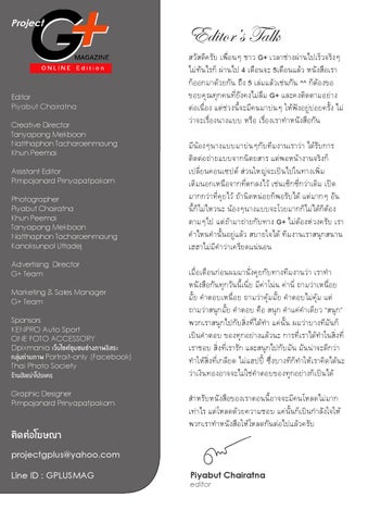 Editor’s Talk Editor Piyabut Chairatna Creative Director Tanyapong Mekboon Natthaphon Tacharoenmaung Khun Peemai Assistant Editor Pimpojanard Prinyapatpakorn Photographer Piyabut Chairatna Khun Peemai Tanyapong Mekboon Natthaphon Tacharoenmaung Kanoksunpol Uttadej Advertising Director G+ Team Marketing & Sales Manager G+ Team Sponsors KENPRO Auto Sport ONE FOTO ACCESSORY Dpixmania เว็บไซต์ชุมชนช่างภาพอิสระ กลุ่มถ่ายภาพ Portrait-only (Facebook) Thai Photo Society ร้านฮัลณ่าโปรแคร Graphic Designer Pimpojanard Prinyapatpakorn