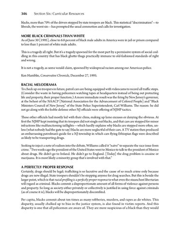 346 Section Six: Curricular Resources blacks, more than 70% of the drivers stopped by state troopers are black. This statistical “discrimination”—to liberals, the worst sin—has prompted the usual commotion and calls for investigation. More Black Criminals than White As of June 30 [1995], close to 6.8 percent of black male adults in America were in jail or prison compared to less than 1 percent of white male adults. This is a tragedy all right. But it’s a tragedy spawned for the most part by a permissive system of social coddling in this country that has black ghetto thugs practically immune to old-fashioned standards of right and wrong. It is not a tragedy, as some would claim, spawned by widespread racism among our American police. Ken Hamblin, Conservative Chronicle, December 27, 1995. Racial Melodrama To check up on troopers in future, patrol cars are being equipped with videocams to record all traffic stops. (Consider the waste in having policemen watching tapes at headquarters instead of being out protecting life and property, their proper function.) A more immediate result was the firing by New Jersey’s governor, at the behest of the NAACP [National Association for the Advancement of Colored People] and “Black Ministers Council of New Jersey,” of the State Police Superintendent, Carl Williams. The reason: he did not go along with the feeble defense other NJ officials were offering of NJHP tactics. These other officials had mostly led with their chins, making up lame excuses or denying the obvious. At first the NJHP kept insisting that its troopers did not single out blacks, and that cars are stopped for minor infractions like malfunctioning taillights—which hardly explains why blacks are stopped more often, unless (what nobody had the guts to say) blacks are more neglectful of their cars. A TV station then produced an embarrassing patrolman’s guide for a NJ township in which cars flying Ethiopian flags were described as likely to be transporting drugs. Seeking to inject a note of realism into the debate, Williams called it “naive” to separate the race issue from crime. “Two weeks ago the president of the United States went to Mexico to talk to the president of Mexico about drugs. He didn’t go to Ireland. He didn’t go to England. [Today] the drug problem is cocaine or marijuana. It is most likely a minority group that’s involved with that.” A Perfectly Proper Response Certainly, drugs should be legal; trafficking is so lucrative and the cause of so much crime only because drugs are now illegal. State troopers shouldn’t be stopping anyone for drug searches. But this is beside the larger point, which is that racial profiling is a perfectly proper response to what even the staunchest libertarian will regard as criminal. Blacks commit a disproportionate amount of all forms of violence against persons and property. So long as society either privately or collectively is justified in using force against criminals (as of course it is), blacks will be disproportionately discomfited. Per capita, blacks commit about ten times as many robberies, murders, and rapes as do whites. This disparity, usually chalked up to bias in the justice system, is also found in victim reports. And this disparity is one that all policemen are aware of. They are more suspicious of a black than they would