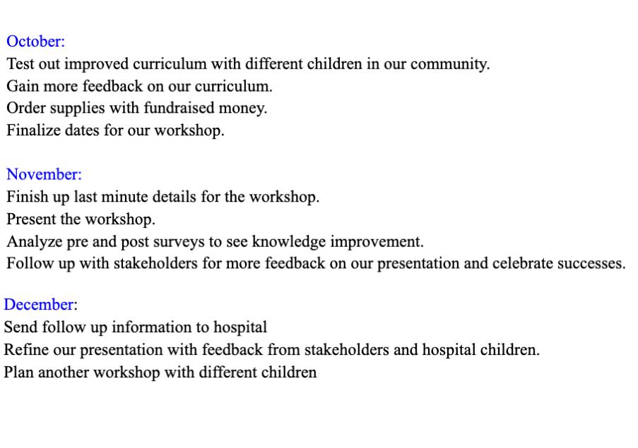 As we understand the importance of education through our research, we hope to implement these prevention measures in children at a young age. In the month of October, we will continue to revise our curriculum through workshops in local schools, until we are confident it can excel at the community level.