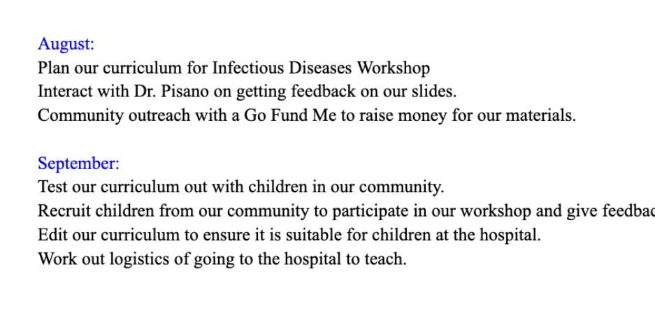 Our intervention intends to target school-age children of ages six to 15 at the local Comer Children’s Hospital, as children are highly vulnerable to acquiring infectious diseases in hospital settings. This population is located in the Chicago area and will likely include a mix of various different ethnicities. We hope to empower at least 20 children to feel confident in protecting themselves and their community from infectious diseases in the future. We plan to start our intervention off with a quick introduction and a slideshow on infectious diseases. Then, we have two engaging games planned to show bacteria and transmission. Our first game is Virus Buster. The objective of this game is to illustrate how the chain of infection works and how infections can be spread. It operates as a freeze tag game where one person will be the host with the virus and tag other people with the virus. When a person gets tagged, they now carry the virus and are frozen, but other children will have to unfreeze them by using prevention methods previously learned including washing hands, wearing a mask, and getting vaccinated. Our second game is Glowing Guardians. The objective of this game is to create a compelling visual representation of prevention methods for infectious diseases. We plan to utilize glow in the dark bacteria kits to showcase bacterial growth before and after hand washing. We will demonstrate the proper hand washing technique and highlight the effectiveness of hand washing to reduce bacterial growth. Finally, we will end with the reflection of the games as well as do a Q&A to answer any unresolved questions. This strategy is likely to be effective: instead of being lecture-based and unengaging for children, we have incorporated various games to capture their attention and convey our message of infectious diseases control. Our timeline to implement this intervention is as follows: