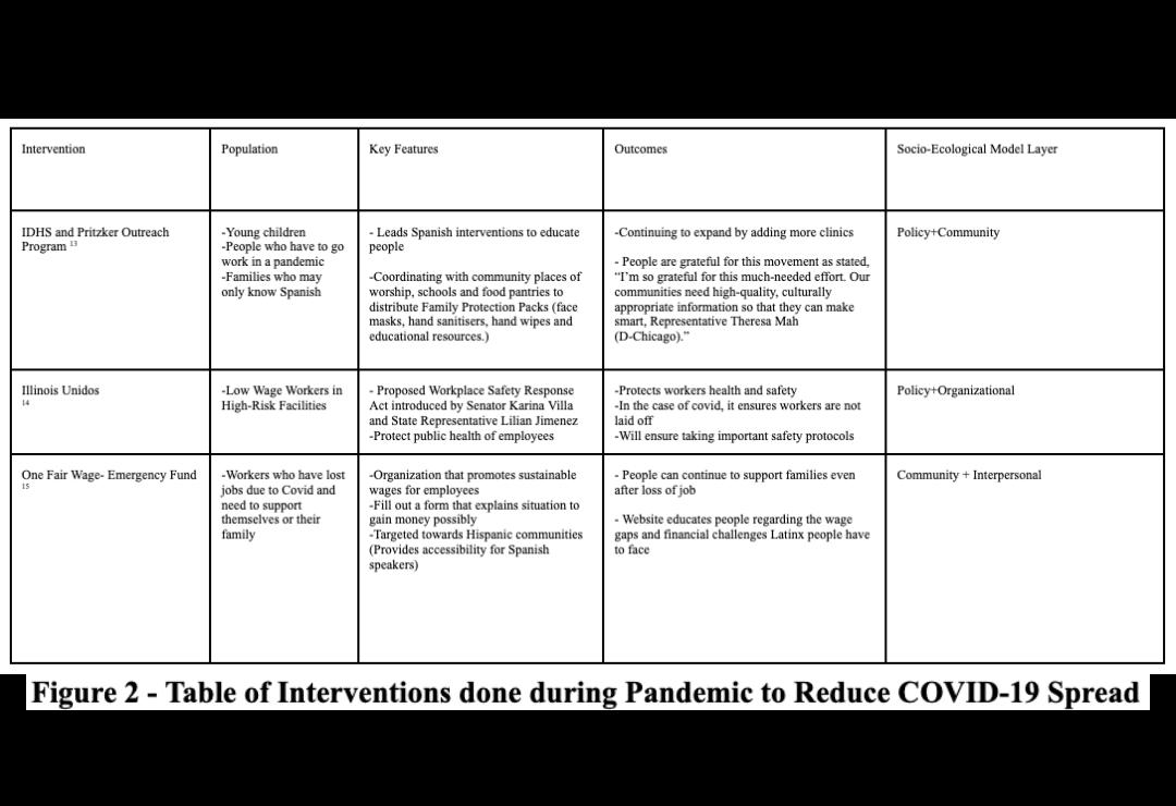 This research project was conducted using 77 government reports, peer reviewed journals, news articles and various other scholarly sources. The first component of the project, the National Literature Review, consisted of 50 scholarly sources that were found through Google Scholar. The team was able to gather data through government websites such as the CDC and Illinois’s state website. For the project’s second component, we reviewed news articles to understand the social impact of the virus while gathering data on patients and prevention strategies to overcome the virus. Finally, the project’s third component, the EBR literature review, consisted of 27 sources, though most of the data is gathered from the U.S Census Bureau. Additionally, the EBR review consists of sources that illustrate current interventions taking place within Illinois to support the Hispanic communities who are impacted by Covid 19.