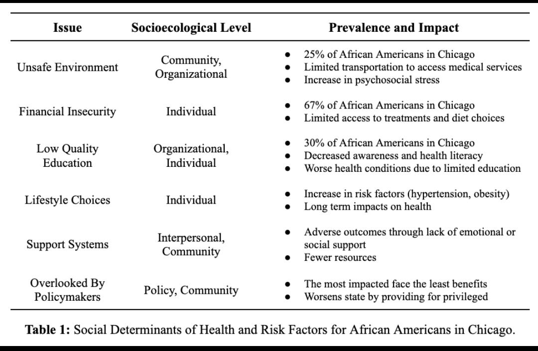 CAD trends are similar nationwide and in Illinois, the target region for our intervention, as African Americans face a 158.8% higher chance of mortality from CAD than any other race in Illinois alone7. Behind this much higher risk of mortality are various social determinants of health and risk factors present in Illinois, especially Chicago, that increase the threat of CAD.
