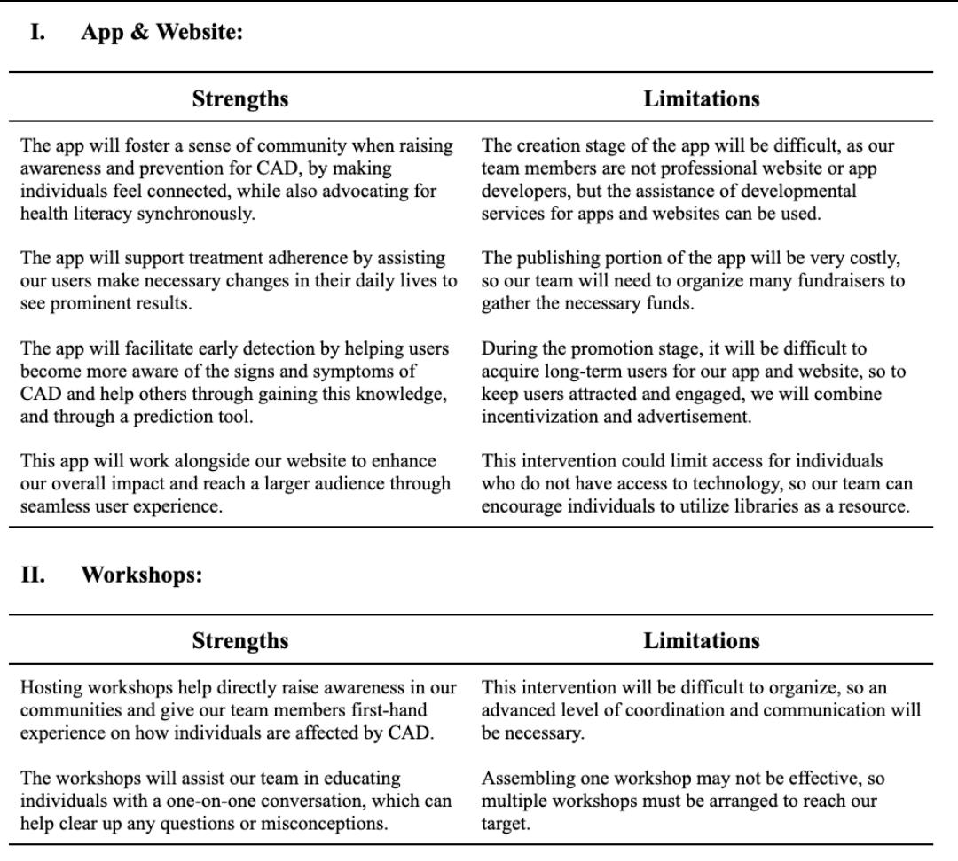 Although there are many strengths that come with our interventions, there are some limitations. Our team must overcome these issues to successfully implement these initiatives and gain the results we aim for in our communities. Possible limitations from our research include accessibility to a greater variety of journals/articles in our literature review. While we compiled adequate resources, we were limited to databases which don’t require fees. Another challenge in our research was finding specific data for the