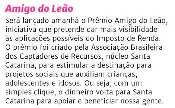 Os candidatos ao Prêmio Amigo do Leão devem comprovar suas ações direcionadas à arrecadação de recursos para os Fundos da Criança e do Adolescente e Fundos do Idoso em Santa Catarina, seja através de doações realizadas ou ações de arrecadação de recursos com doadores. Os candidatos podem ter sede em qualquer local do Brasil, desde que comprovem ação empreendida para os fundos catarinenses.