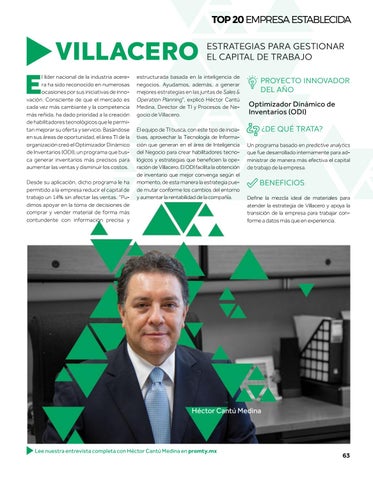 estructurada basada en la inteligencia de negocios. Ayudamos, además, a generar mejores estrategias en las juntas de Sales & Operation Planning”, explicó Héctor Cantú Medina, Director de TI y Procesos de Negocio de Villacero. El equipo de TI busca, con este tipo de iniciativas, aprovechar la Tecnología de Información que generan en el área de Inteligencia del Negocio para crear habilitadores tecnológicos y estrategias que beneficien la operación de Villacero. El ODI facilita la obtención de inventario que mejor convenga según el momento, de esta manera la estrategia puede mutar conforme los cambios del entorno y aumentar la rentabilidad de la compañía.