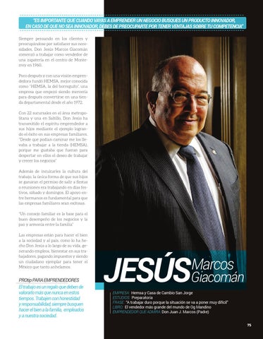 EMPRESA: Hemsa y Casa de Cambio San Jorge ESTUDIOS: Preparatoria FRASE: “A trabajar duro porque la situación se va a poner muy difícil” LIBRO: El vendedor más grande del mundo de Og Mandino EMPRENDEDOR QUE ADMIRA: Don Juan J. Marcos (Padre)
