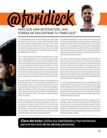 Más que una motivación, una forma de encontrar tu “para qué” “No tengo idea de quién sea Farid Dieck pero este video realmente me conmovió y espero algún día poder decir como él: ‘cambié mis lágrimas por sonrisas’”. Son más de 10 mil comentarios, de este tipo, y 11 millones de vistas, tan sólo en Facebook, los que acumula uno de los videos más populares de este joven emprendedor social y creador de contenido motivacional. “Tú no estás aquí por un porqué, estás aquí por un para qué”, predica Farid Dieck en sus exitosas publicaciones, que han traspasado fronteras por diversos países de Latinoamérica y que le han permitido impactar positivamente a una de las generaciones más incomprendidas. “La razón principal de empezar a crear videos, o mi ‘para qué’, fue prácticamente utilizar mi vida como un instrumento para el bien de la humanidad y de esa manera usar las redes sociales para transmitir un mensaje esperanzador, que creo que es lo que le hace mucha falta a este mundo”, destacó Farid.