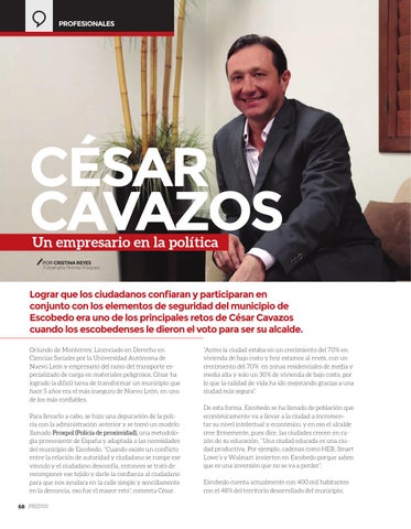 Lograr que los ciudadanos confiaran y participaran en conjunto con los elementos de seguridad del municipio de Escobedo era uno de los principales retos de César Cavazos cuando los escobedenses le dieron el voto para ser su alcalde. Oriundo de Monterrey, Licenciado en Derecho en Ciencias Sociales por la Universidad Autónoma de Nuevo León y empresario del ramo del transporte especializado de carga en materiales peligrosos, César ha logrado la difícil tarea de transformar un municipio que hace 5 años era el más inseguro de Nuevo León, en uno de los más confiables. Para llevarlo a cabo, se hizo una depuración de la policía con la administración anterior y se tomó un modelo llamado Proxpol (Policía de proximidad), una metodología proveniente de España y adaptada a las necesidades del municipio de Escobedo. “Cuando existe un conflicto entre la relación de autoridad y ciudadano se rompe ese vínculo y el ciudadano desconfía, entonces se trató de recomponer ese tejido y darle la confianza al ciudadano para que nos ayudara en la calle simple y sencillamente en la denuncia, eso fue el mayor reto”, comenta César. 68