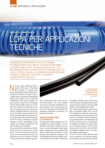 LCPA PER APPLICAZIONI TECNICHE RADICIGROUP PERFORMANCE PLASTICS È SEMPRE PIÙ CONCENTRATA SULLA MESSA A PUNTO DI POLIAMMIDI A CATENA LUNGA (LCPA) - PA 6.10, PA 6.12 E PA 5.10 - CHE RISPONDONO, OLTRE ALLA NECESSITÀ DI PRESTAZIONI DI ALTO LIVELLO TECNICO, ANCHE ALLA SEMPRE MAGGIORE DOMANDA DI PRODOTTI DERIVANTI DA FONTE TOTALMENTE O PARZIALMENTE BIOLOGICA