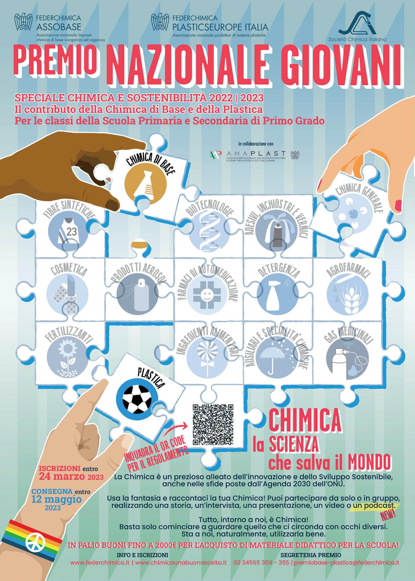La chimica è una delle industrie dove è più sicuro lavorare e vanta da anni una posizione di primo piano nellʼambito di sicurezza e salute nei luoghi di lavoro Il rapporto Responsible Care, gestito in Italia da Federchimica, è giunto alla sua 28a edizioneAnche nel 2022, il Festival della Scienza di Genova ha ospitato, in modalità digitale, la cerimonia conclusiva del “Premio Nazionale Giovani - Sezione chimica di base e plastica” per la scuola primaria e secondaria di primo grado. Giunto alla sua 25a edizione, il concorso si propone di sensibilizzare i giovani sul contributo della chimica di base e della plastica rispetto al benessere, alla qualità della vita e a un modello di sviluppo sostenibile. Il concorso è promosso da Assobase e PlasticsEurope Italia - le associazioni di Federchimica che rappresentano il comparto industriale della chimica di base e delle materie plastiche - dalla Società Chimica Italiana - l’associazione scientifica che ha lo scopo di promuovere lo studio e il progresso della chimica e delle sue applicazioni - e da Amaplast - l’associazione dei costruttori italiani di macchine e attrezzature per la lavorazione delle materie plastiche e della gomma. L’iniziativa è inoltre realizzata in collaborazione con l’Ufficio Scolastico regionale per la Lombardia e l’Ufficio Scolastico territoriale di Milano. Alla manifestazione hanno partecipato in video collegamento gli oltre 1.700 vincitori, tra i 6 e i 14 anni, provenienti da 17 scuole di tutta Italia, dalle provincie di Ancona, Bari, Barletta-Andria-Trani, Belluno, Caserta, Catanzaro, Como, Cremona, Fermo, Milano, Napoli, Taranto, Treviso, Venezia. I lavori presentati e premiati - manufatti, ricerche e video sulla chimica di base e sulla plastica - hanno entusiasmato la giuria, che ne ha apprezzato qualità, creatività e, in molti casi, grande
