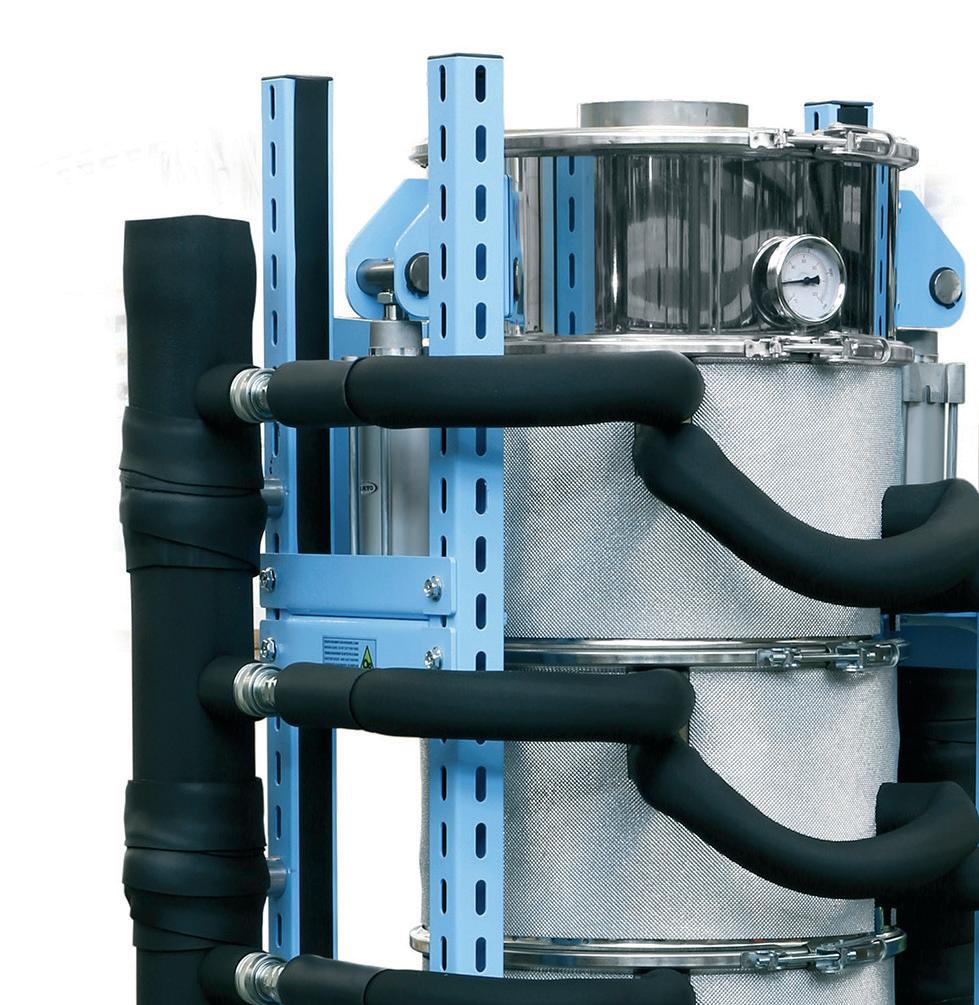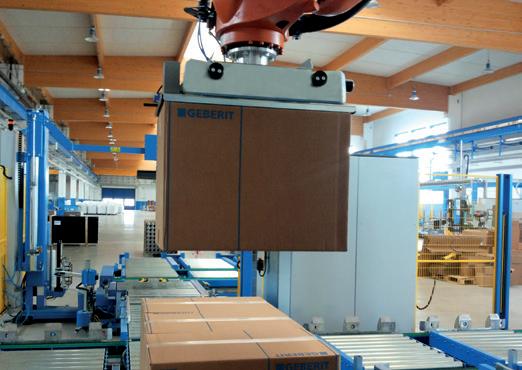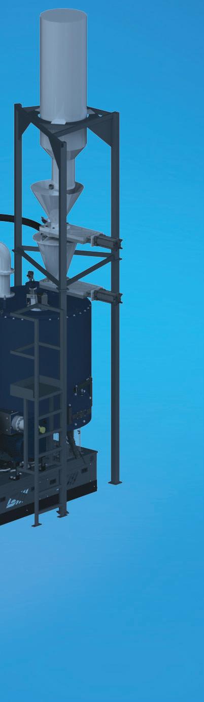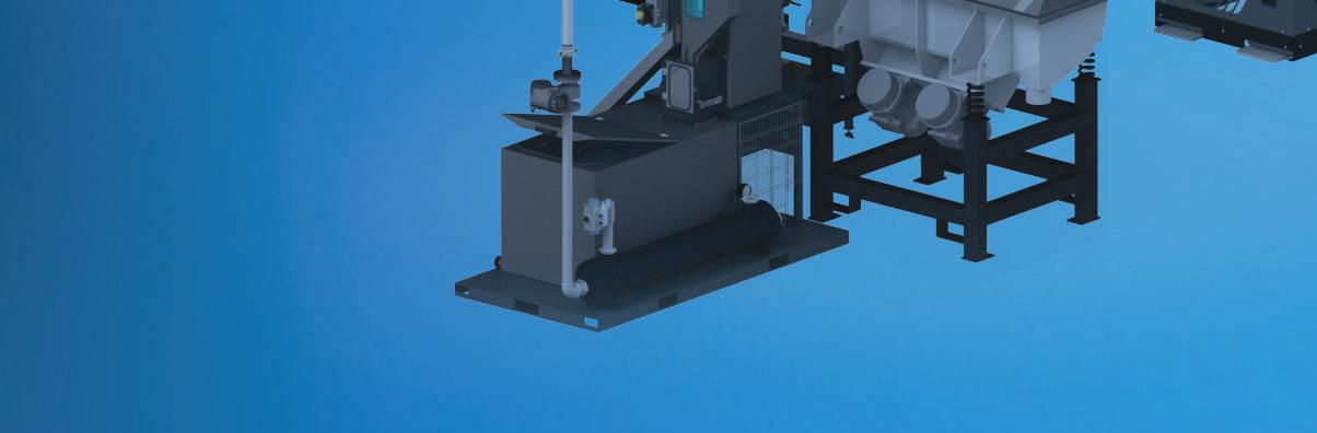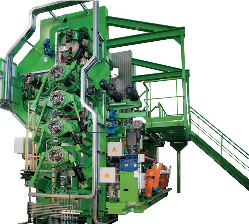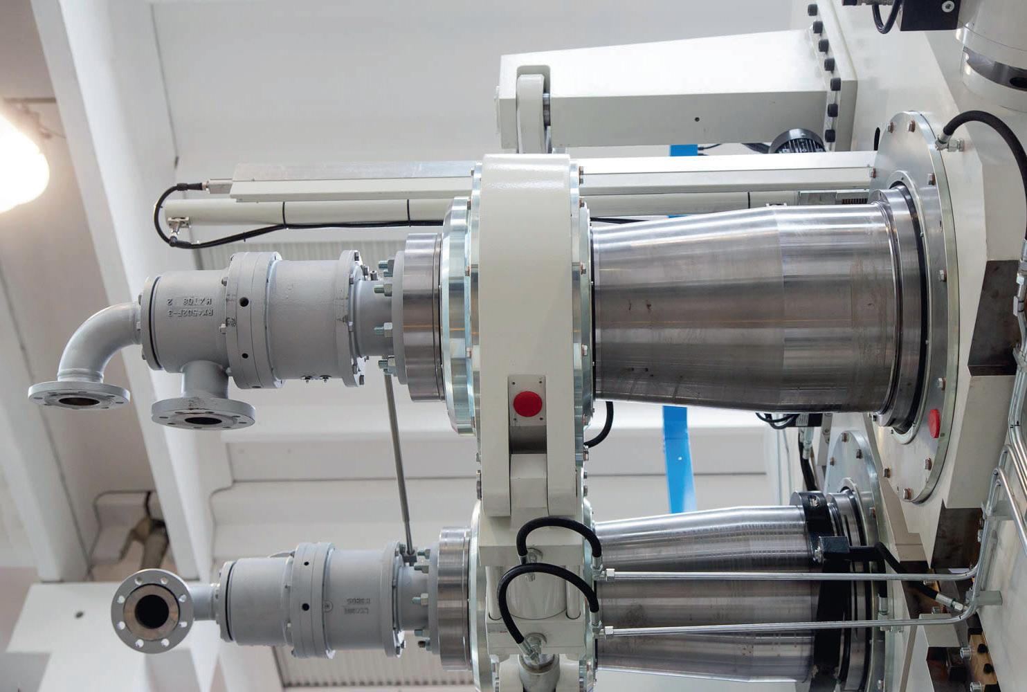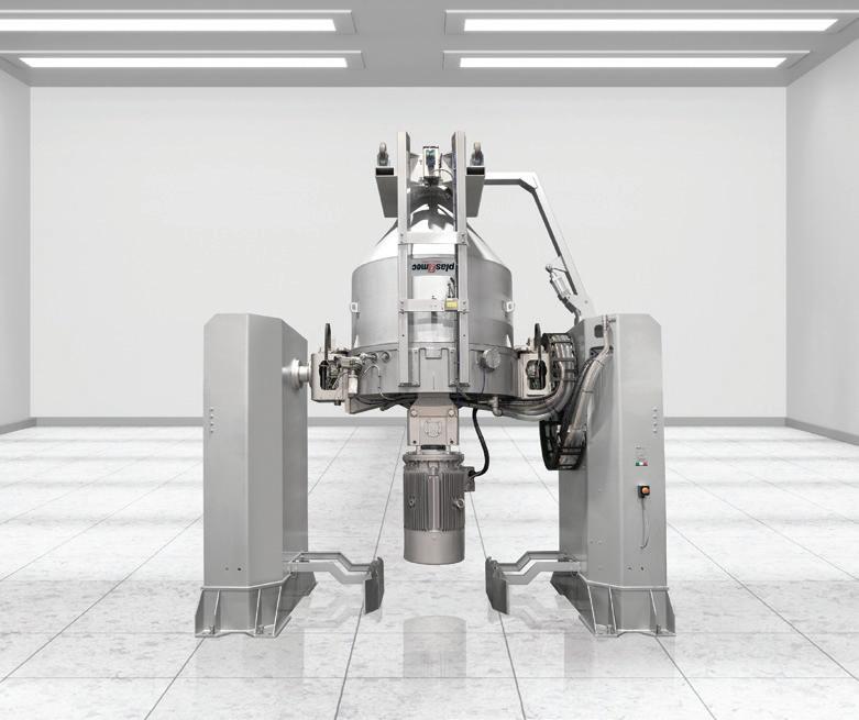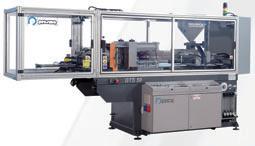 allowing very flexible production. In particular, the Coex3 model with three extruders and a single carriage presented at the show has a 700-mm stroke and a double head for producing 4-litre bottles with handles in a twocavity mould. The machine, which is also equipped with a scraps recovery line with a volumetric system for dosing and feeding the resins to the three extruders, is intended for a producer of bottles ranging from 55 ml to 2 litres for various sectors such as chemicals, food, cosmetics, oil etc.