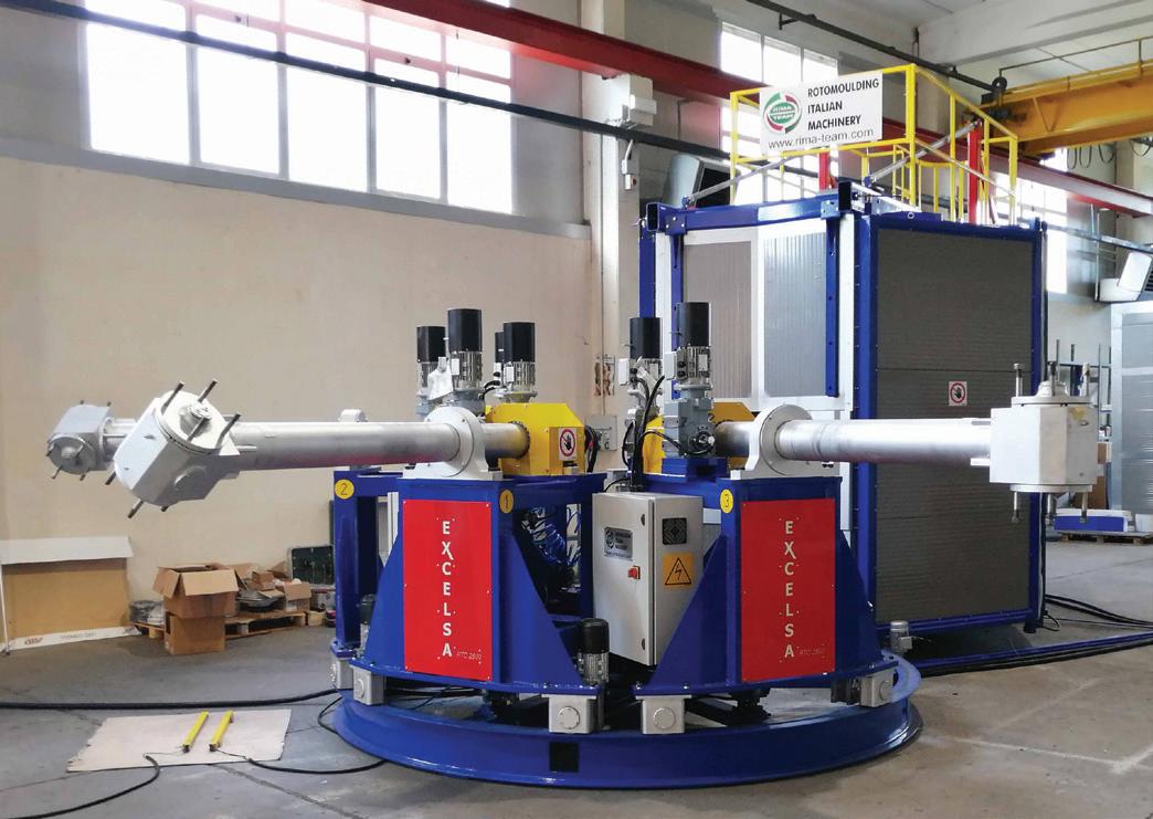 Rotational moulding equipment manufacturer Rima Team recently supplied a Maxima carousel machine (one of those that it proposes at Plast 2023, together with the other two machine families, Suprema, a swing type, and Maxima, a shuttle type), with a spherical diameter of 4,000 mm and two carriages (with two straight arms and one square arm in addition), to a Welsh processor to produce fuel tanks. Due to the low height of the production department, the thermal chamber has been lowered by 500 mm and consequently lowering the flame guard pipes by splitting the intake ducts. Because of the smaller size of the chamber, there was a risk that the 1000 kW burner would get too hot and deform the protections, and therefore the chamber was coated with stainless steel, resistant to high temperatures. In this way the heat has been concentrated in the oven, improving heating times that, in addition to a double intake system to maintain constant air flows with telescopic manifolds, allows a