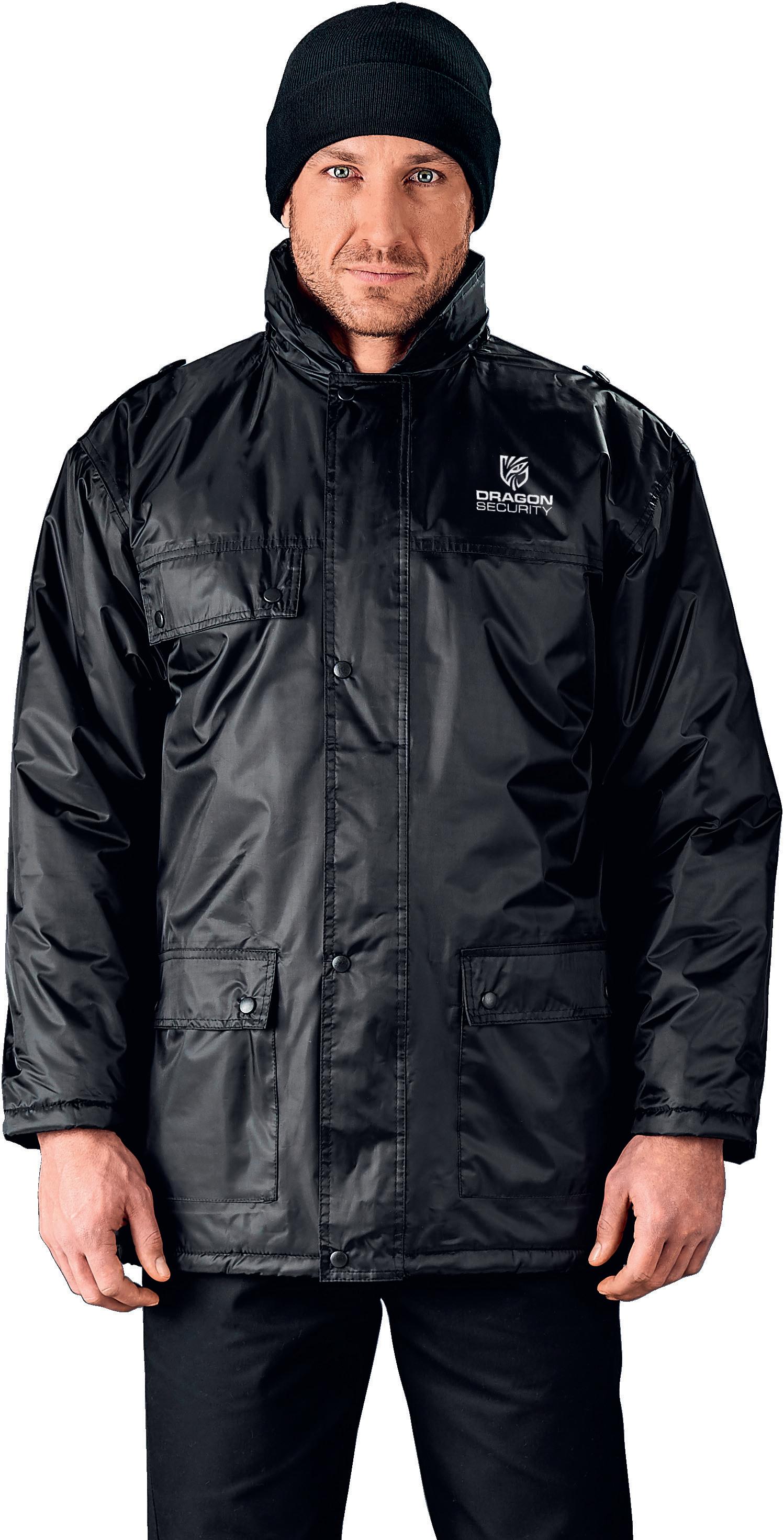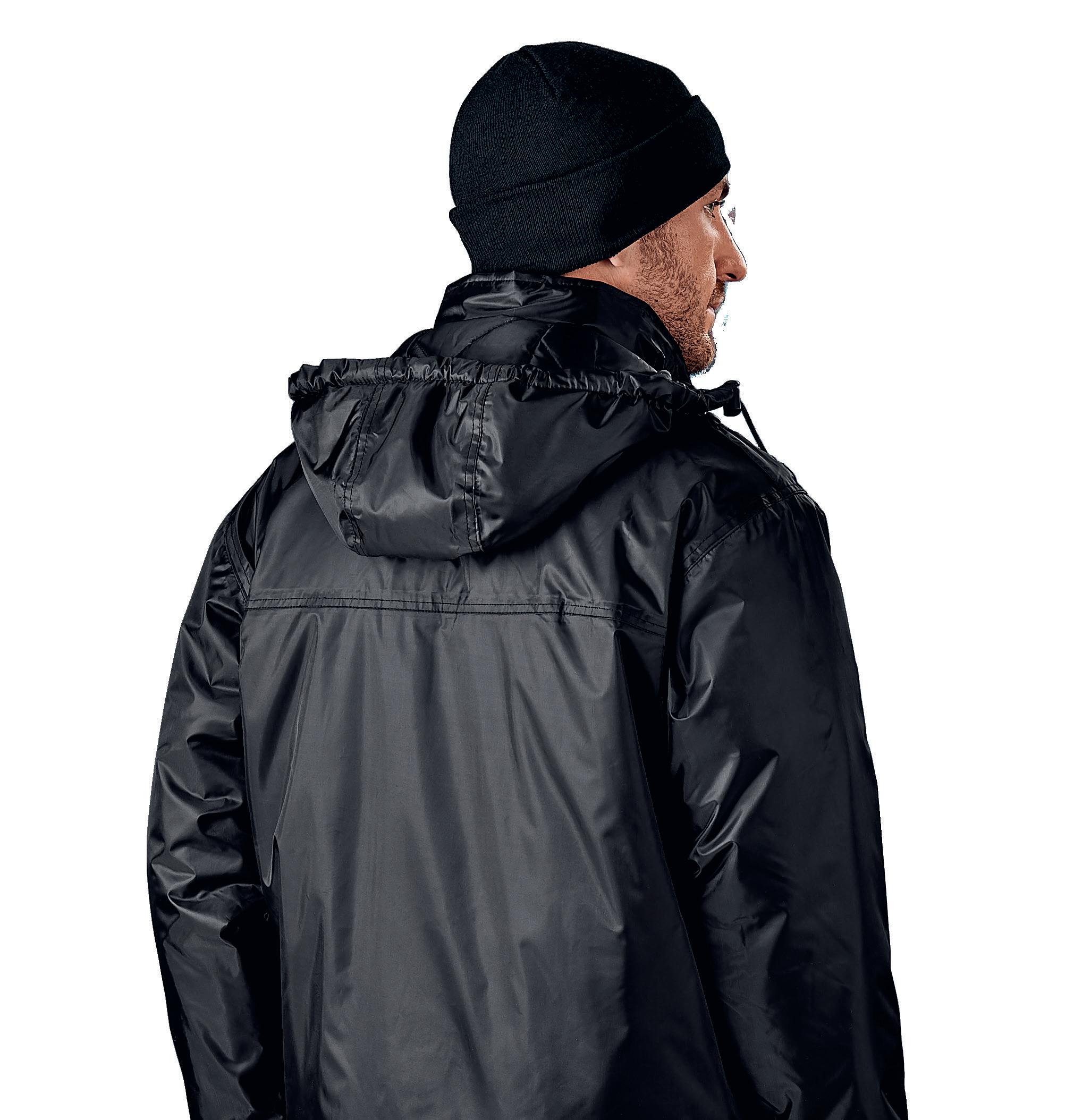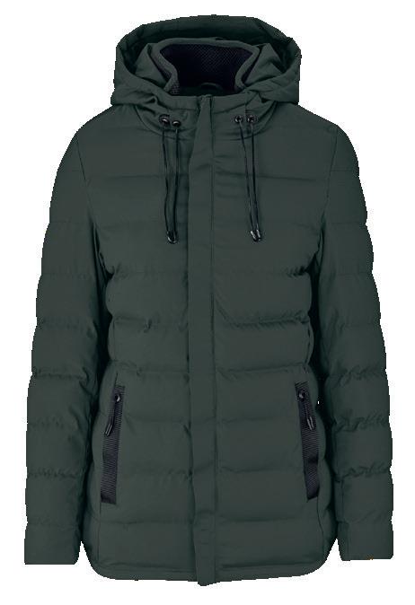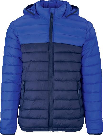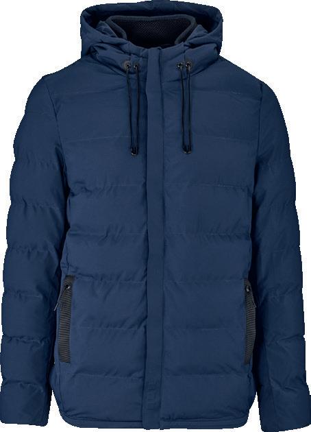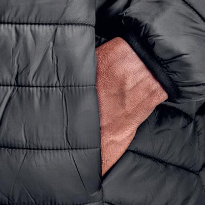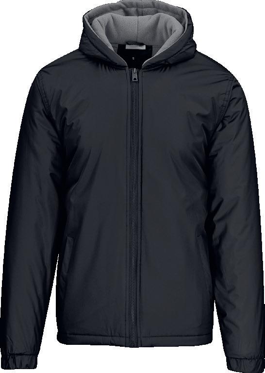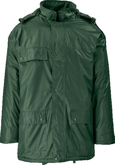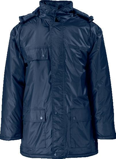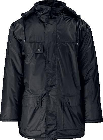 Fabric 100% polyester with PVC coating, polar fleece lining, polyester wadding • fully padded jacket with hood • elasticated cuffs • inner chest pocket • welt pockets • water resistant