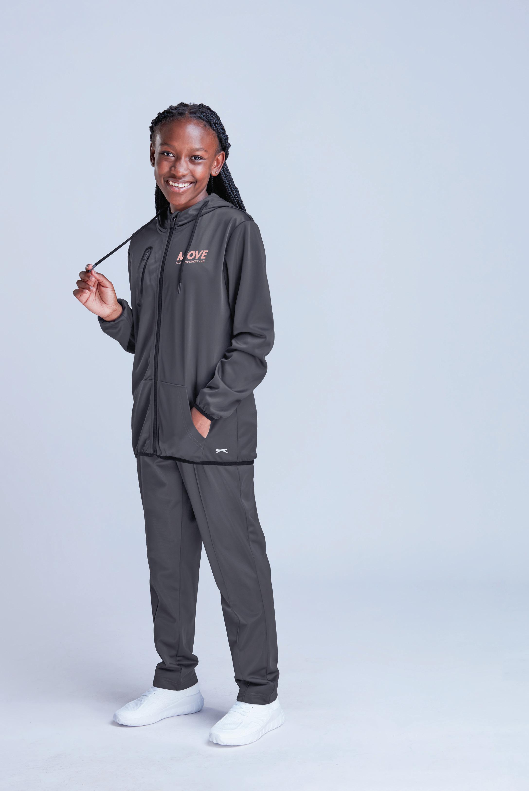Weight 230g/m2 Fabric 100% polyester, satin sports knit • top: full zip with hood • contrast elasticated ribbing at hem and sleeves • features contrast chest zip pocket detail • reflective Slazenger logo • bottom: elasticated waistband with inner drawcord • tapered legs • reflective Slazenger logo