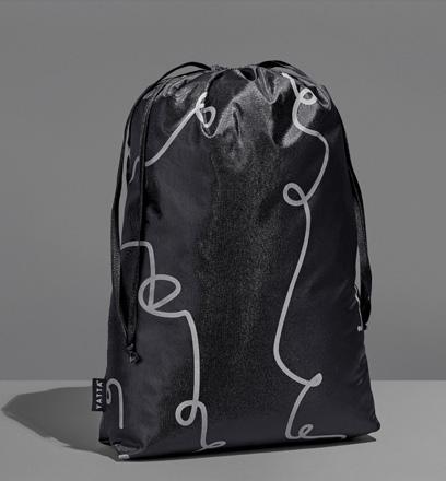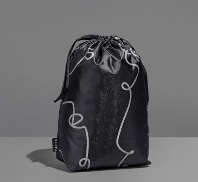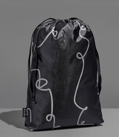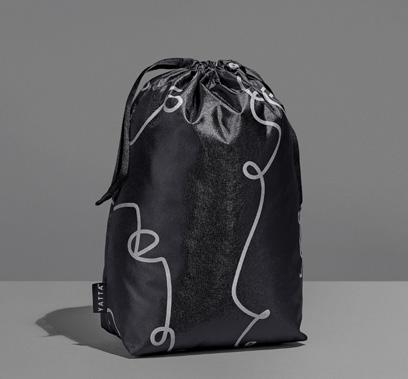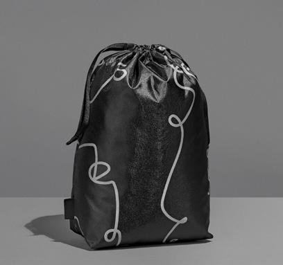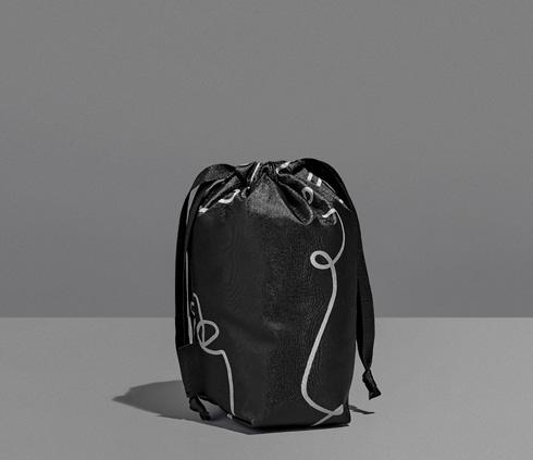 hamper contents are presented in an elegant drawstring bag