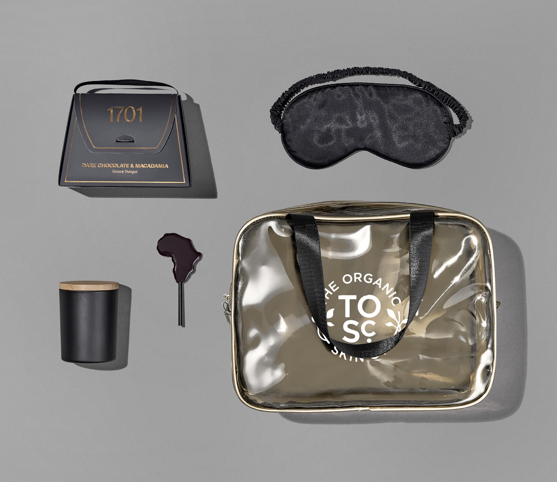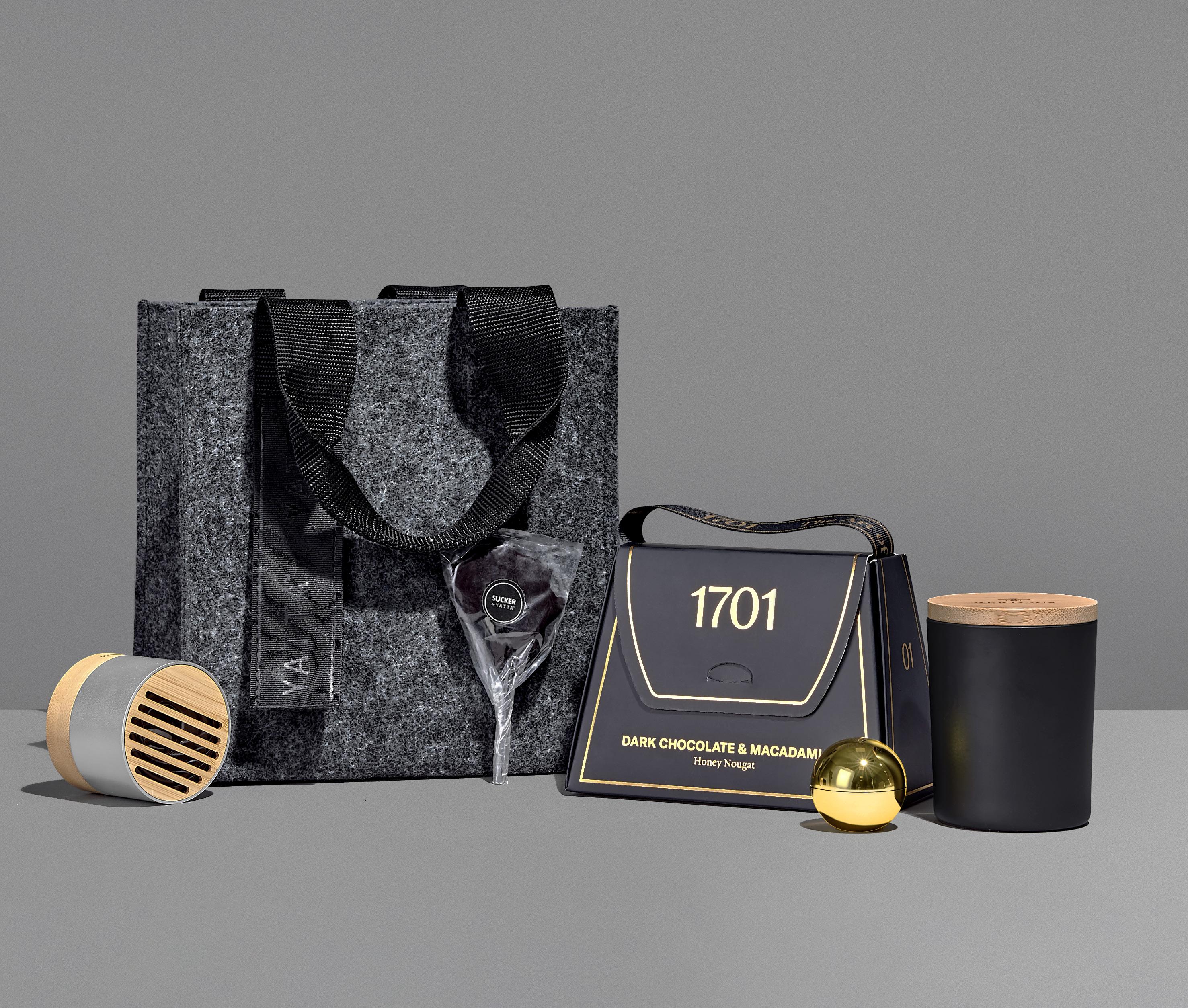 hamper contents are presented in an elegant drawstring bag and then packaged into a luxury felt gift bag