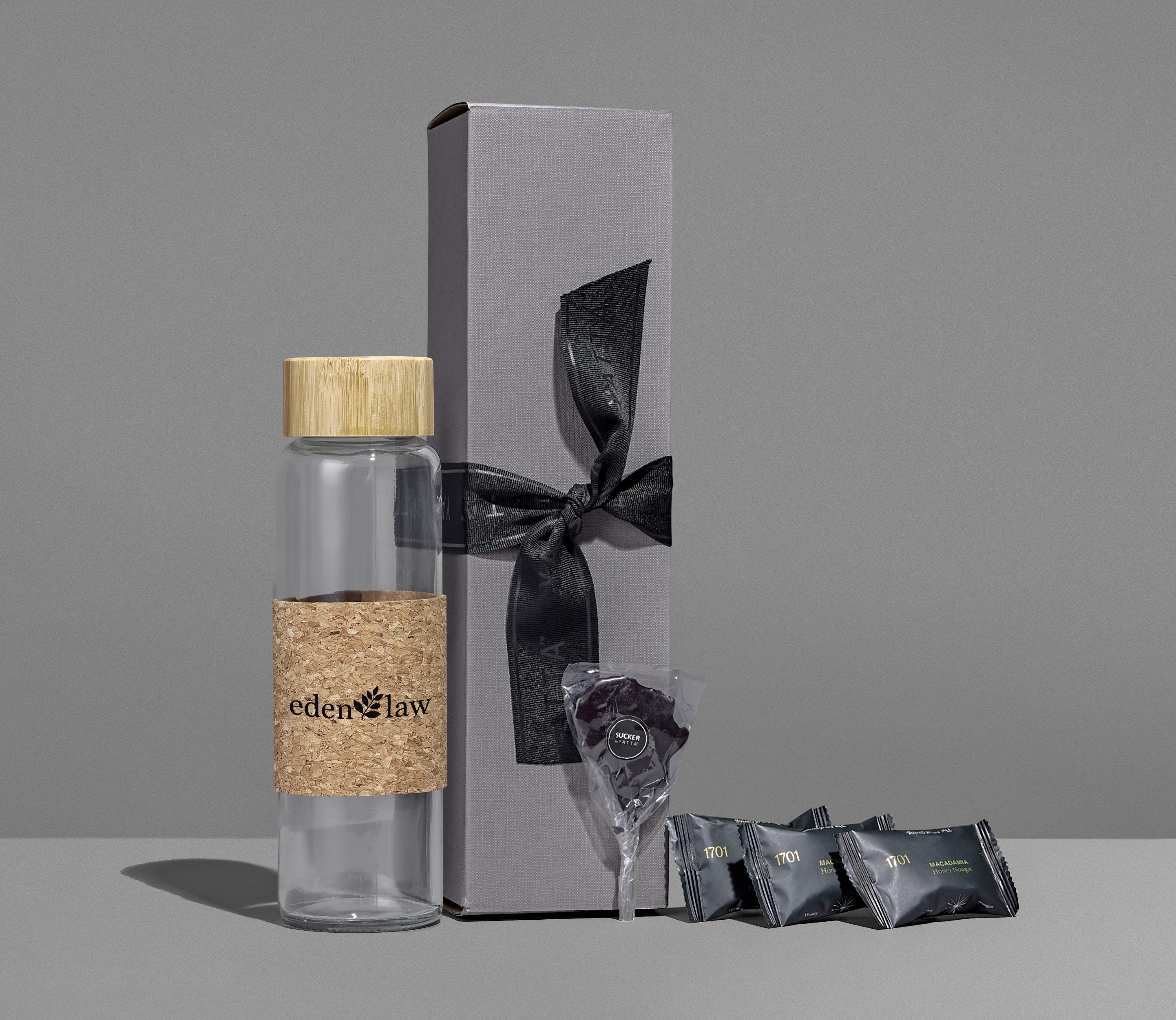 hamper contents are presented in an elegant drawstring bag and then packaged into a premium gift box