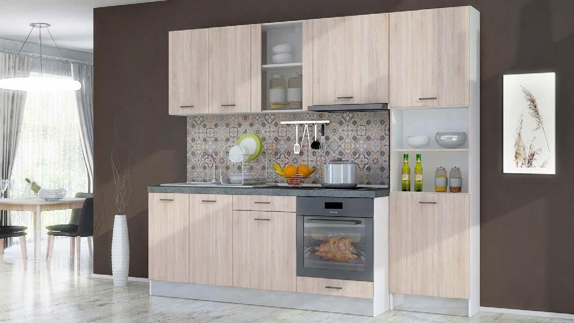 ГАРА НЦИЯ ГАРА Н ЦИЯ 5 ГОДИНИ 1) Стойността на кухните се формира само от кухненските шкафове и не включва електроуреди, мивка, смесител, механизми и аксесоари. Oтстъпките не са валидни за вече направени поръчки и не важат за изделия, за които е обявена друга промоция. Отстъпката за C elina важи при поръчка на стойност над 2000 лв. Кухня с лице в топъл и наситен дървесен декор Дъб Хавана, с дълбоки и контрастни акценти в черно. Със система профили-дръжки от черен метал. ГАРА НЦИЯ ГАРА Н ЦИЯ 5 ГОДИНИ 6458,C‘ELINA SYLT, ГР. 7 /AIKO ВАРИАНТ 255 СМ/