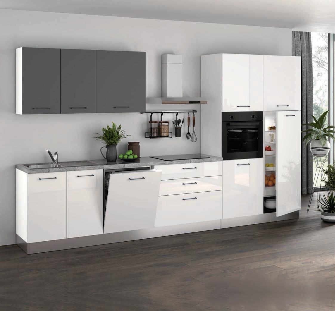 Материал ПДЧ/МДФ. Цвят Бял Гланц/Сив. Габаритен размер 350 x 60 x 216 h см. Всички модули са сглобени, с монтирани в тях електроуреди BEKO, мивка и смесител, включени в цената. Без стенен панел! Възможност за разполагане на високите модули отляво или отдясно в конфигурацията. Механизми и панти с плавно затваряне. Няма възможност за избор на допълнителни аксесоари и дръжки. Електроуреди: абсорбатор 90см, инокс, с LED светление, 4 зонов стъклокерамичен котлон с тъч контрол, фурна за вграждане, черен цвят, 3 функции, хладилник за вграждане, общ обем 220l, съдомиялна за пълно вграждане, вместимост 13 к-та, 5 програми.