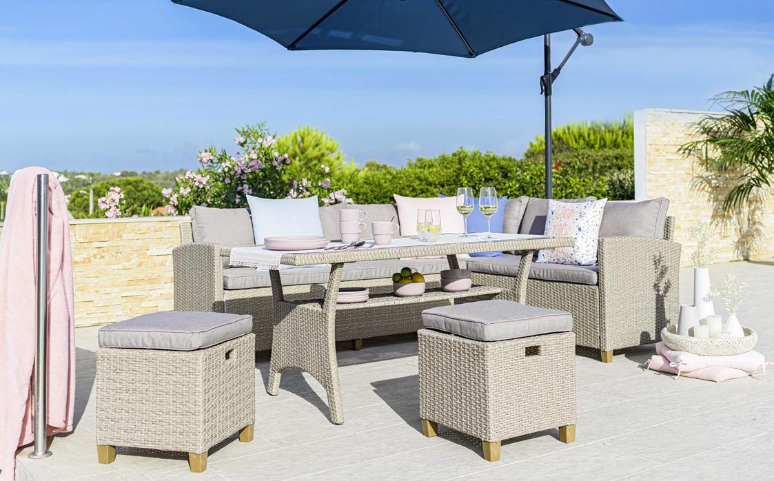 Градински комплект канапе-ляво 175/67/73 см, канапе-дясно 165/67/73 см, табуретка 40/40/40 см, маса 145/74/67 см 1599,- 959,- ( 71463020001 )