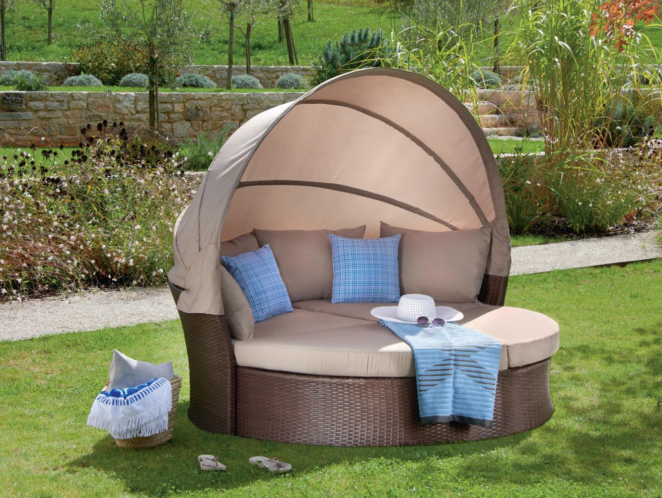 Градинско легло с навес и пълен комплект (8 бр.) възглавници в бежов цвят. Стабилна метална конструкция и кафяв PVC ратан 184/197/74 см ( 90263060001 )