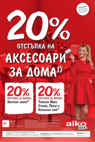 Всички посочени в брошурата цени са валидни от 21.02. до 06.03.2022г. или до изчерпване на количествата. Промоцията e валидна от 21.02. до 27.02.2022г. и не важи за мебели, електроуреди, мивки, смесители, храни и напитки. Отстъпката не важи за продукти, за които е обявена друга промоция. 2) Промоциите са валидни от 21.02. до 06.03.2022г. Отстъпките не важат за продукти, за които е обявена друга промоция. 1)