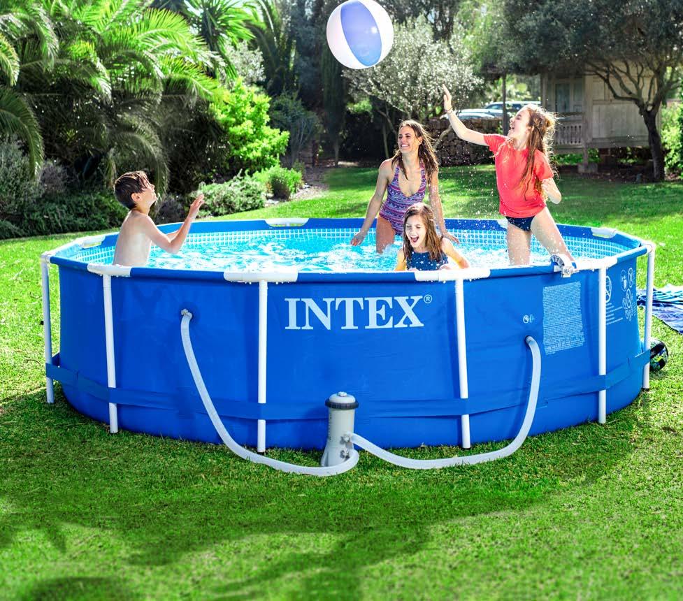 Metallrahmen; 3-lagiges Material; Wasserkapazität: ca. 7.199 L (bei 90 % Füllung); leistungsstarke Kar tuschenfilteranlage: 12 V, mit Transformator 230–240 V; inkl. Pumpe und Oberflächenskimmer; ca. 84 cm hoch ; Stück