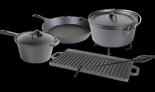 Gusseisen-Set, 6-tlg. Pfanne, Topf, Dutch Oven, Grillplatte, Untersetzer, Deckelhaken, passend für Grill oder Ofen, einfache Reinigung
