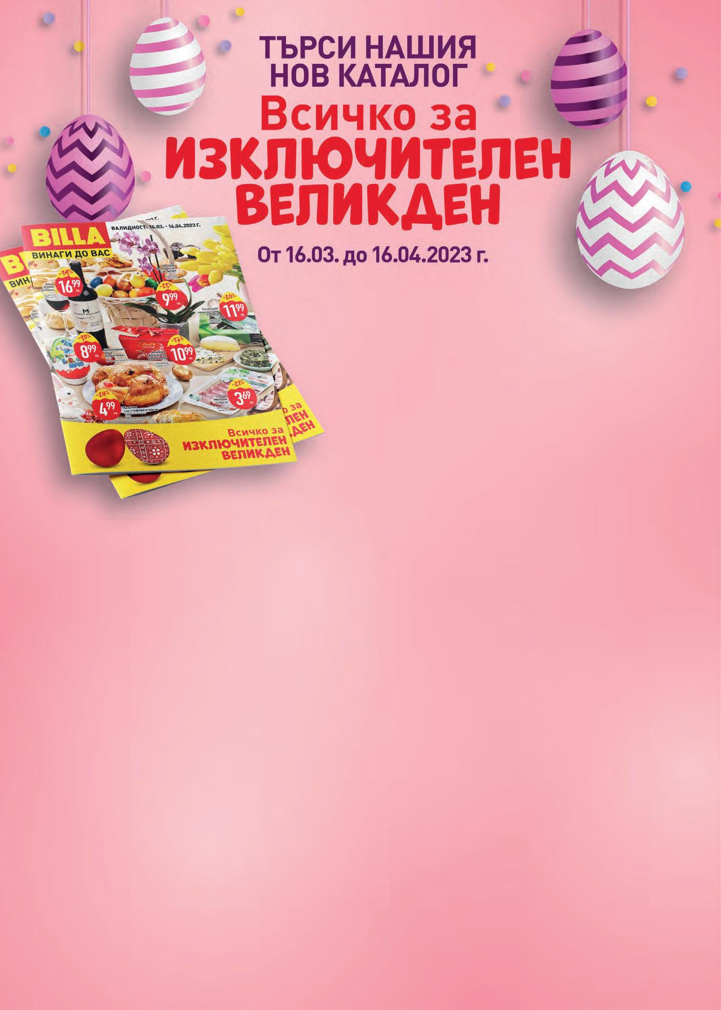 3 * Офертата е валидна от 31.03.2023 г. до 02.04.2023 г. или до изчерпване на наличните количества. Само с BILLA Card. Офертата не се прилага за продукти от седмични акции (червени цени), артикули с етикет „Сега в BILLA“, както и за други стоки с намалени цени.