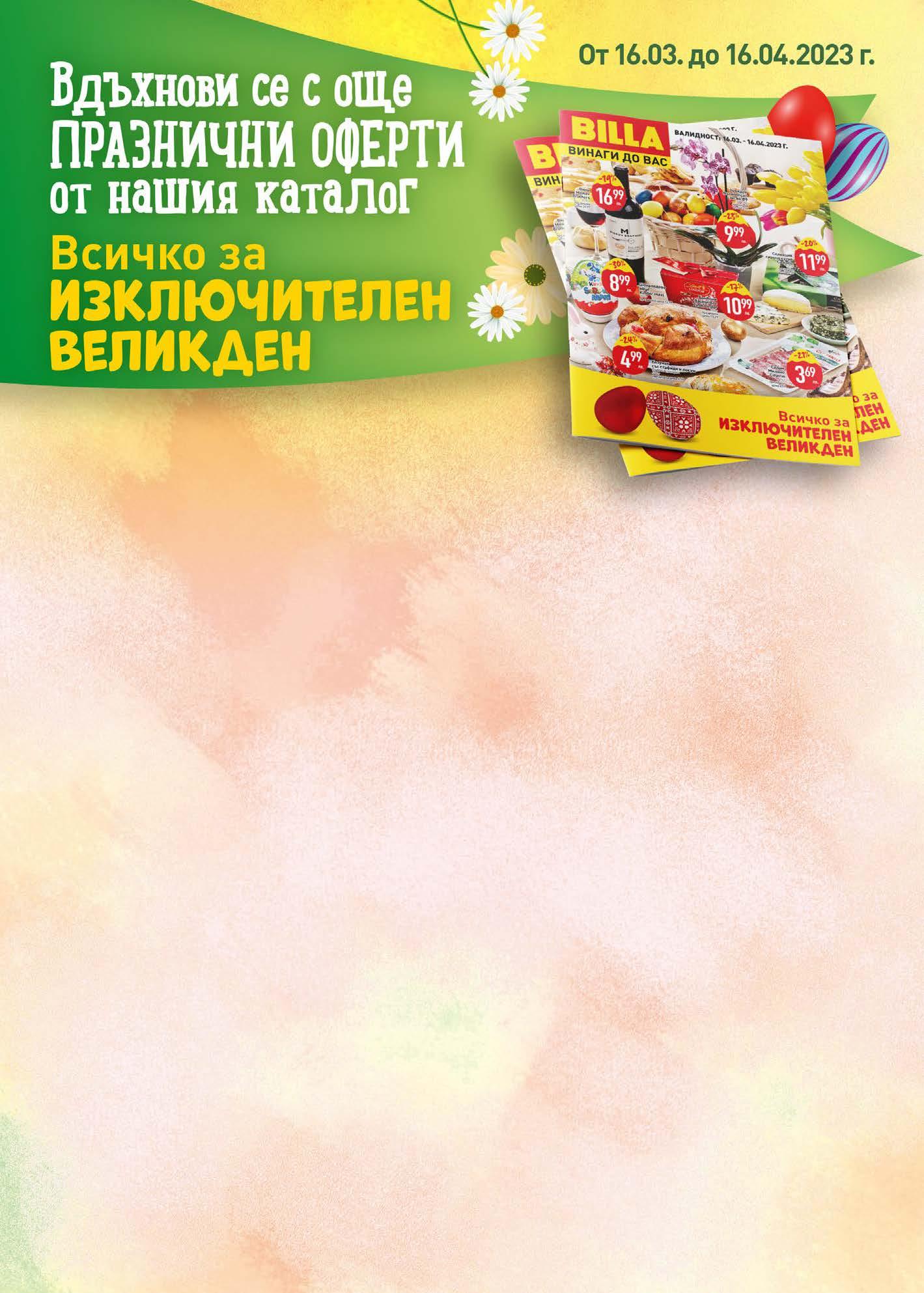 -25% 15.04. ПТ 14.04. 16.04. СБНД Всички оферти са валидни до изчерпване на количествата, като стоките се продават в количества, предназначени за домакинството. Посочените цени са в български лева с включен ДДС. BILLA не носи отговорност за допуснати печатни грешки. BILLA си запазва правото да променя цените.