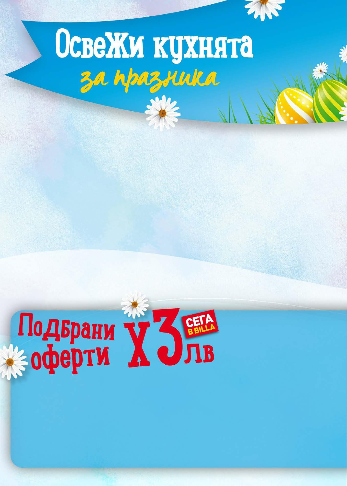 * Офертата е валидна от 14.04.2023 г. до 16.04.2023 г. или до изчерпване на наличните количества. Само с BILLA Card. Офертата не се прилага за продукти от седмични акции (червени цени), артикули с етикет „Сега в BILLA“, както и за други стоки с намалени цени. Отстъпката получаваш веднага на каса. Изображенията са илюстративни.