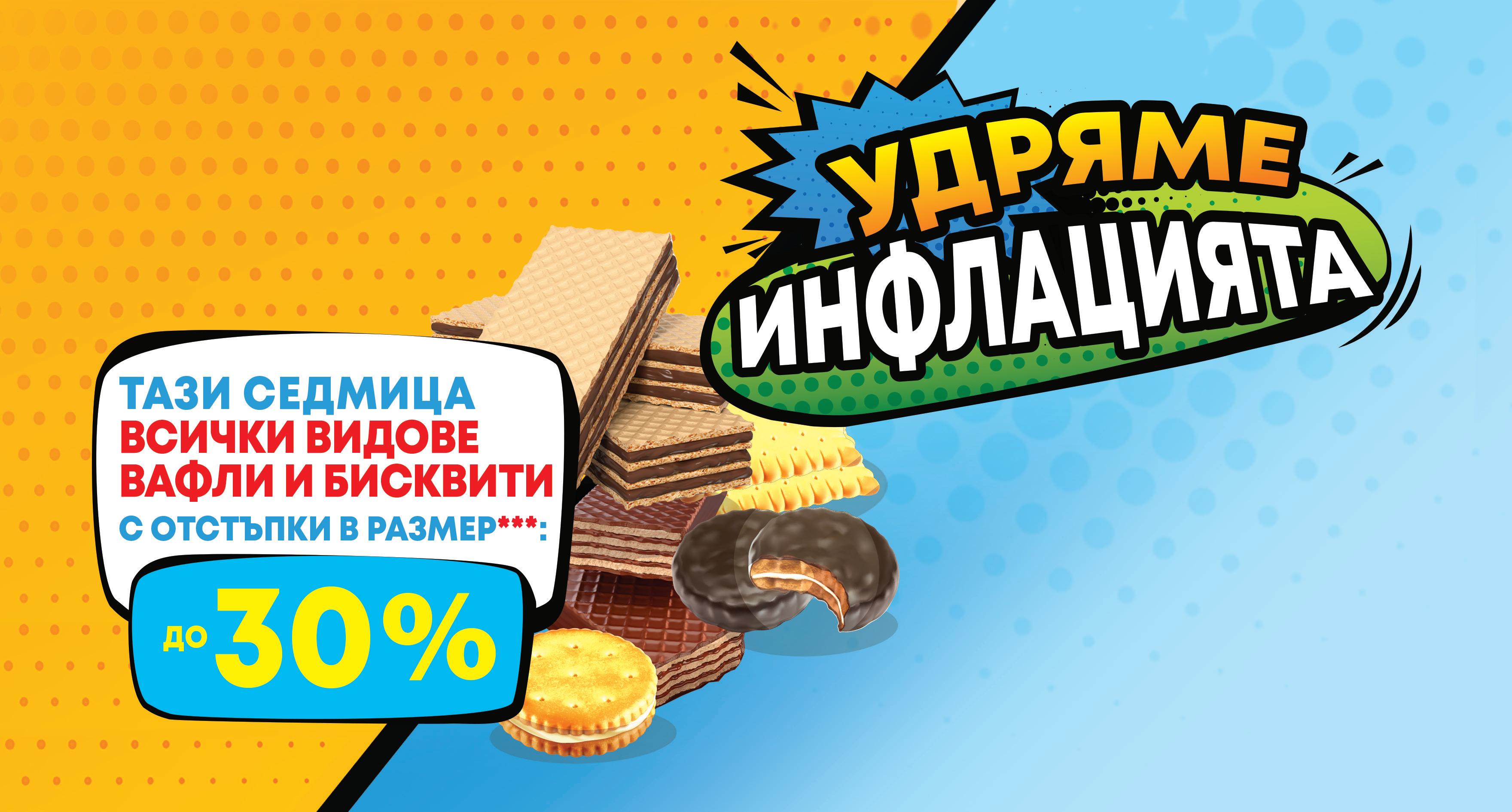 Цените важат и при комбинация на различни видове от посочените артикули. ПО-ПО-НА-СМЕТКА за 3 бр. и повече за 2 бр. Скумрия котлет „РУСАЛКА” различни видове, 300 г -20% 3,25 259 бр. САМО 3,25 279 бр. за 1 бр. САМО 3,25 299 бр. ПО-ПО-НА-СМЕТКА за 3 бр. и повече за 2 бр. Пилешки крила мариновани, печени, бр. -27% 1,09 079 бр. 1,09 089 бр. за 1 бр. САМО 1,09 099 бр. ПО-ПО-НА-СМЕТКА за 3 бр. и повече за 2 бр. Царевица или грах „BONDUELLE” 400 - 425 мл -40% 3,69 219 бр. -29% 3,69 259 бр. за 1 бр. -18% 3,69 299 бр. ПО-ПО-НА-СМЕТКА за 3 бр. и повече за 2 бр. Кроасан „7DAYS” различни видове, 92 г -18% 1,59 129 бр. -15% 1,59 135 бр. за 1 бр. САМО 1,59 145 бр. СЪБОТА и НЕДЕЛЯ 22.04. - 23.04.2023 Отстъпката важи за изброените групи продукти само с карта „благодаря“ ЧЕТВЪРТЪК и ПЕТЪК 20.04. - 21.04.2023 -25% -25% ТОАЛЕТНИ ХАРТИИ, КУХНЕНСКИ РОЛКИ И САЛФЕТКИ* *не важи за стоки, участващи в други промоции; МАКАРОНЕНИ ИЗДЕЛИЯ И ВАРИВА* 2 ПО-ПО-НА-СМЕТКА за 3 бр. и повече за 2 бр. Студен чай „FUZETEA” разлини видове, 1,5 л -20% 3,09 245 бр. -16% 3,09 259 бр. за 1 бр. САМО 3,09 279 бр. ПО-ПО-НА-СМЕТКА за 3 бр. и повече за 2 бр. Енергийни напитки „MONSTER” различни видове, 500 мл -20% 2,49 199 бр. -16% 2,49 209 бр. за 1 бр. САМО 2,49 219 бр.