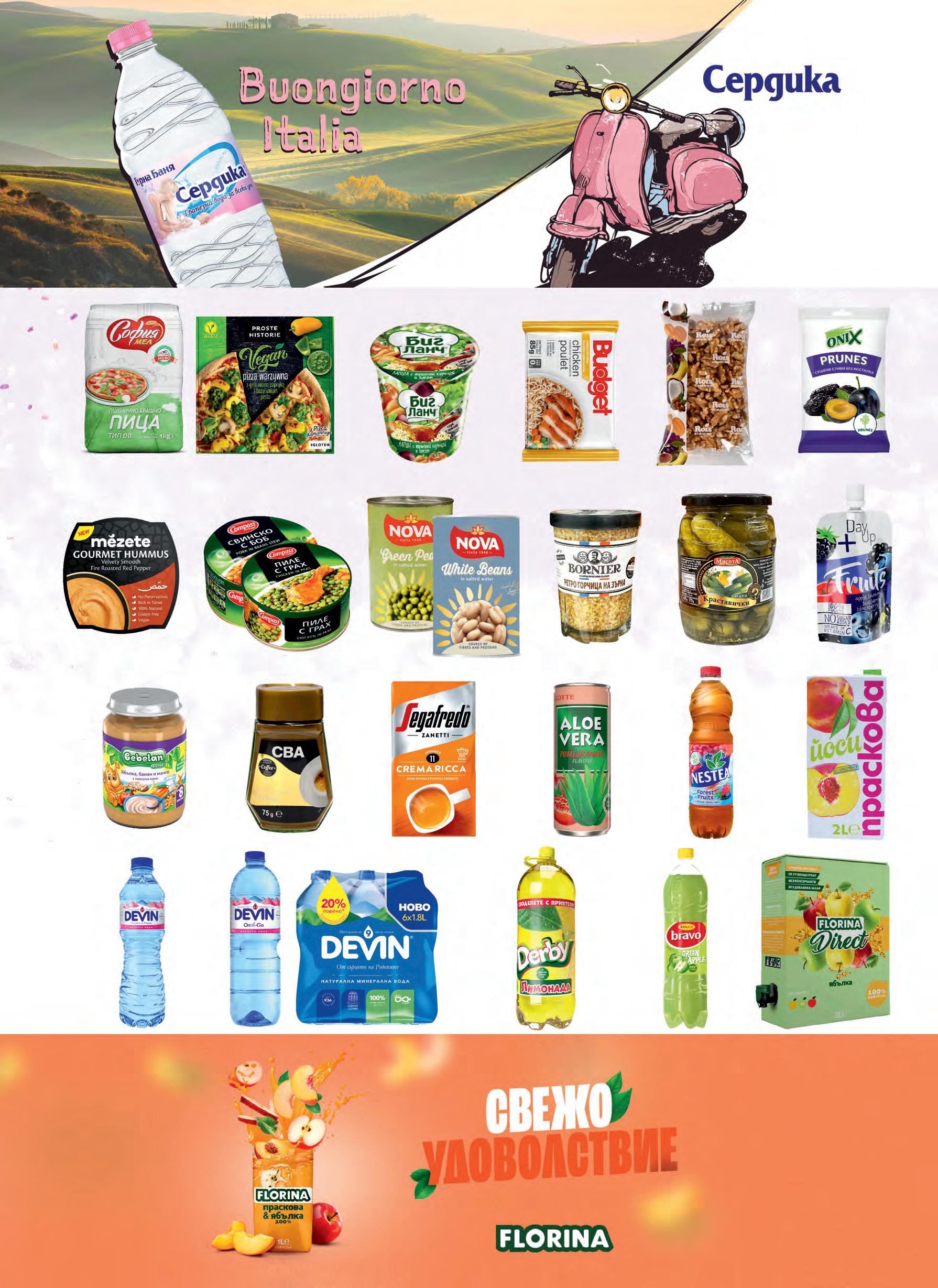 Мусака 300 г COMPASS NOVA различни видове 400 г Боб / Грах BORNIER Горчица ретро 150 г 720 мл Краставички МИСОТА 3-6 см Day up BEBELAN различни видове Пюре 100 г BEBELAN 4 - 8+ м 190 г различни видове Каша Crema CBA Разтворимо кафе 75 г Кафе Rich grоund cream SEGAFREDO 250 г мляно LOTTE Aloe Vera кен различни видове Напитка 240 мл NESTEA различни видове Студен чай 1,5 л DEVIN 500 мл Изворна / Минерална вода DEVIN Otg Изворна / Минерална