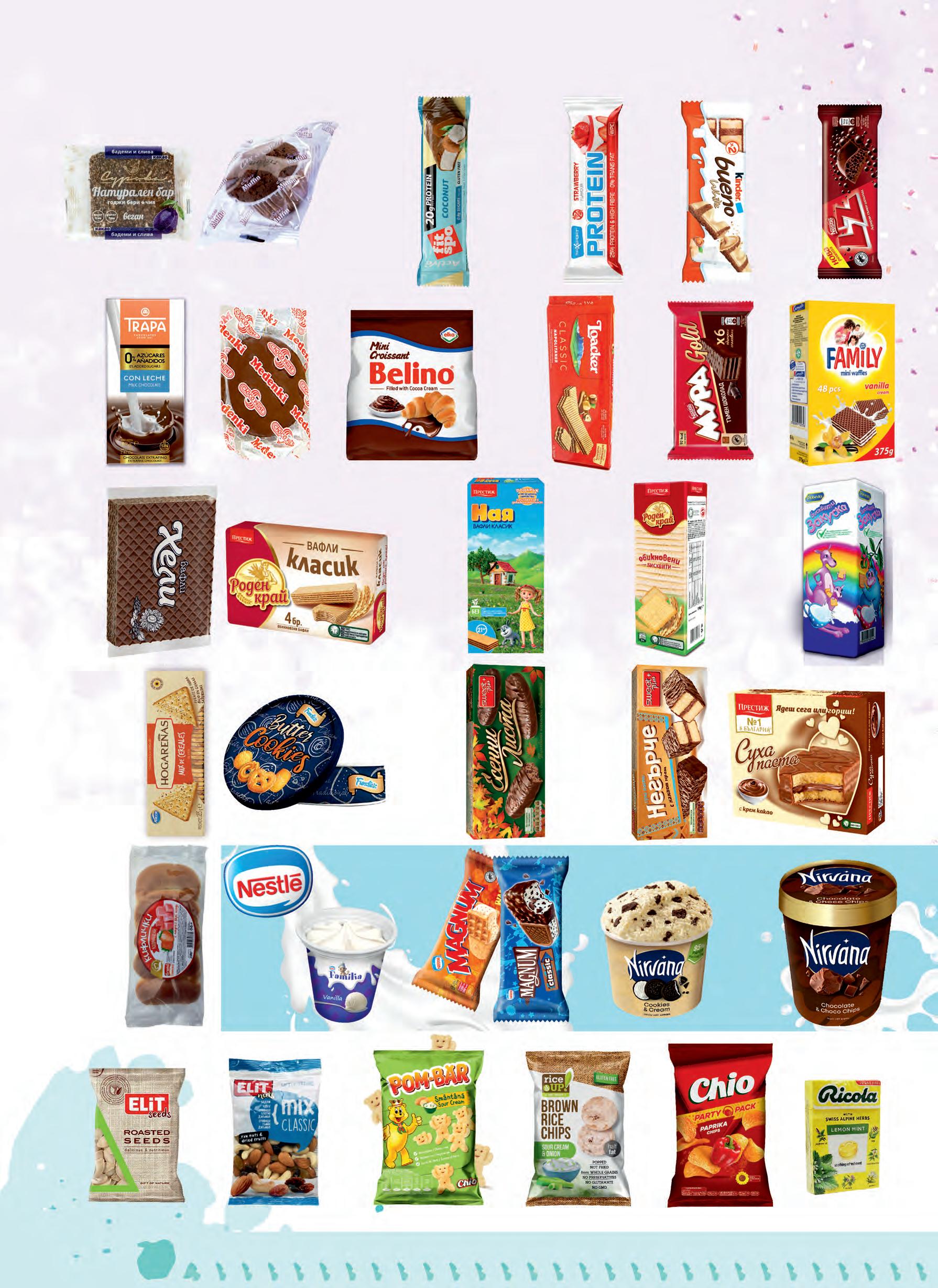 Веган бар различни видове СУРОВА 40 г Мъфин 40 г ванилия / какао OVI&SARI Aktive / 60 г Протеинов бар FIT SPO Lo carb различни видове Protein MAX SPORT 60 г Протеинов бар различни видове Десерт KINDER Bueno бял / млечен 39 / 43 г 36 г Шоколад млечен / тъмен NESTLE LZ Шоколад различни видове TRAPA 80 / 100 г CHOCO PAUSE Меденка 50 г BELINO Кроасани мини крем какао / милфей 185 г различни видове Вафли LOACKER 175 г NESTLE 6 x 1318 г различни видове Вафли Мура Gold KARMELA различни видове 375 г Family Мини вафли ХЕЛИ Вафли Ретро бял шоколад / шоколад 240 г ПРЕСТИЖ Вафли Роден край 120 г ПРЕСТИЖ 28 бр. в кутия Вафли Ная различни видове 190 г Обикновени бисквити Роден край ПРЕСТИЖ ПОБЕДА 315 г Обикновени бисквити Закуска 185 - 200 г Бисквити различни видове HOGARENAS Маслени бисквити FUNDIEZ 114 г SWEET PLUS Бисквити Есенни листа какаови 135 г видове Суха паста Негърче 160 г различни SWEET PLUS ПРЕСТИЖ Сухи пасти различни видове 10 бр. в кутия Кифлички 250 г GRAND COMERS различни видове Тиквени семки 70 г ELIT Ядки 80 г ELIT Mix сурови, класик Снакс 50 г POM-BАR различни видове RICE UP Оризов чипс различни видове 60 г Чипс CHIO 255 г различни видове RICOLA Билкови бонбони 40 г различни видове 2,79 1, бр. 99 -28% 1,29 0, бр. 99 7,19 5, кут. 19 1,99 1, бр. 69 3,79 2, бр. 89 -23% 2,45 1, бр. 99 3,99 2, бр. 49 -37% 2,59 2, бр. 09 2,79 2, бр. 29 4,49 2, кут. 99 3,49 2, бр. 69 -22% 1,85 1, бр. 25 -32% 2,85 2, бр. 29 1,99 1, бр. 59 -20% 1,79 1, бр. 59 6,19 4, бр. 79 -22% 2,29 1, бр. 99 4,49 3, бр. 79 0,65 0, бр. 49 -24% 3,19 2, бр. 69 3,79 2, бр. 99 3,69 3, пак. 09 4,59 3, бр. 59 -21% 1,49 1, бр. 19 -20% 0,99 0, бр. 79 -20% 3,19 2, бр. 59 3,49 2, бр. 79 -20% 1,89 1, бр. 49 -21% 1,39 1, бр. 19 Familia Сладолед ванилия / какао 58 г Magnum Sandwich различни видове 90 г Сладолед Сладолед Nirvana различни видове 97 – 104 г 322 – 365 г Сладолед различни видове Nirvana 1,39 0, бр. 99 -28% 3,49 2, бр. 19 -37% 4,19 2, бр. 69 -35% 14,69 9, бр. 49 -35% -21% -27% -33%