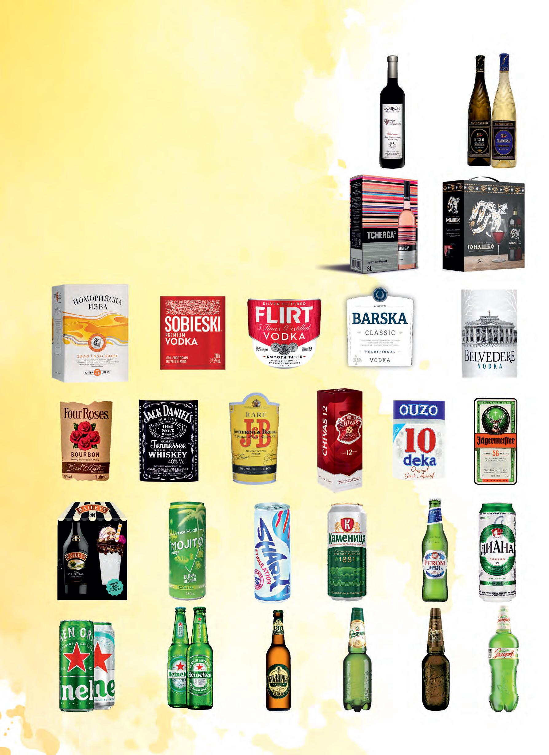 2 л Бира ЗАГОРКА 1 л STAROPRAMEN Бира тъмно 1 л STAROPREMEN Бира 500 мл БОЛЯРКА Бира 500 мл HEINEKEN Classic / Silver Бира Classic / Silver Бира HEINEKEN кен 500 мл Бира кен 500 мл ДИАНА PERONI 330 мл Бира Бира 330 мл КАМЕНИЦА кен SHARK 250 мл Енергийна напитка кен кен различни видове MOCKTAIL Коктейл 250 мл Ликьор + Чаша 1 бр. BAILEYS 700 мл JEGERMEISTER 700 мл Ликьор Узо DEKA 700 мл 12 years old CHIVAS REGAL Уиски 1 л J&B Уиски 1 л 700 мл JACK DANIELS Уиски FOUR ROSES Бърбън 1 л BELVEDERE 700 мл Водка BARSKA 1 л Водка 700 мл FLIRT Водка 700 мл SOBIESKI Premium Водка Вино ПОМОРИЙСКА ИЗБА различни сортове 5 л 750 мл DOBROFF Вино кюве 4 friends TARGOVISHTE Вино шардоне / мускат 750 мл Вино различни сортове TCHERGA 3 л ЮНАШКО бяло / розе / червено 3 л Вино 9,99 5, бр. 99 -40% 7,89 5, бр. 89 -25% 24,99 19, бр. 99 -20% 11,99 6, бр. 99 -41% 12,99 8, бр. 49 0,59 0, бр. 39 -33% 2,69 1, бр. 79 -33% 1, бр. 19 2,19 1, бр. 89 1,09 0, бр. 95 1,29 1, бр. 09 2,69 2, бр. 29 2,79 2, бр. 39 2, бр. 39 2,69 1, бр. 50 33,99 27, кут. 99 34,99 29, бр. 99 42,99 36,бр. 99 37,99 24, бр. 99 -34% 65,99 57, кут. 99 24,99 21, бр. 99 23,99 21, бр. 29 15,49 12, бр. 49 79,99 62, бр. 99 -21% червено Вино Stallion classic 750 мл Young Stallion Вино червено 750 мл Stallion траминер Вино 750 мл Stallion Вино розе 750 мл совиньон блан / бяло Stallion selection Вино 750 мл 24,99 17, бр. 49 -30% 17,59 12,бр. 29 -30% 20,99 14, бр. 49 -30% 17,29 11, бр. 99 -30% 20,99 14, бр. 69 -30% 1 2 4 3 1 2 3 4 5 5 11,99 10,бр. 99 14,69 11, бр. 69 -20% -34% -44% 2,49 1, бр. 50 -39% *В цената не е включен амбалаж. Цена на амбалажа: 0,29 лв./ бр. *В цената не е включен амбалаж. Цена на амбалажа: 0,24 лв./ бр. +18 +18