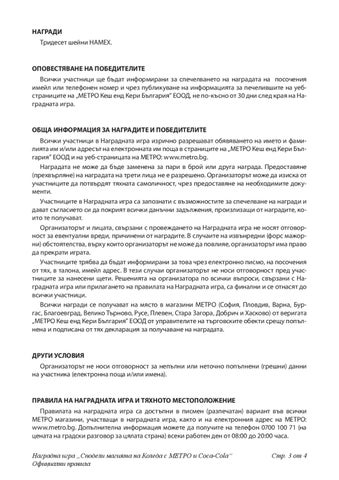 ОБЩА ИНФОРМАЦИЯ ЗА НАГРАДИТЕ И ПОБЕДИТЕЛИТЕ Всички участници в Наградната игра изрично разрешават обявяването на името и фамилията им и/или адресът на електронната им поща в страниците на „МЕТРО Кеш енд Кери България” ЕООД и на уеб-страницата на МЕТРО: www.metro.bg. Наградата не може да бъде заменена за пари в брой или друга награда. Предоставяне (прехвърляне) на наградата на трети лица не е разрешено. Организаторът може да изиска от участниците да потвърдят тяхната самоличност, чрез предоставяне на необходимите документи. Участниците в Наградната игра са запознати с възможностите за спечелване на награди и дават съгласието си да покрият всички данъчни задължения, произлизащи от наградите, които те получават. Организаторът и лицата, свързани с провеждането на Наградната игра не носят отговорност за евентуални вреди, причинени от наградите. В случаите на извънредни (форс мажорни) обстоятелства, върху които организаторът не може да повлияе, организаторът има право да прекрати играта. Участниците трябва да бъдат информирани за това чрез електронно писмо, на посочения от тях, в талона, имейл адрес. В тези случаи организаторът не носи отговорност пред участниците за нанесени щети. Решенията на организатора по всички въпроси, свързани с Наградната игра или прилагането на правилата на Наградната игра, са финални и се отнасят до всички участници. Всички награди се получават на място в магазини МЕТРО (София, Пловдив, Варна, Бургас, Благоевград, Велико Търново, Русе, Плевен, Стара Загора, Добрич и Хасково) от веригата „МЕТРО Кеш енд Кери България” ЕООД от управителите на търговските обекти срещу попълнена и подписана от тях декларация за получаване на наградата.