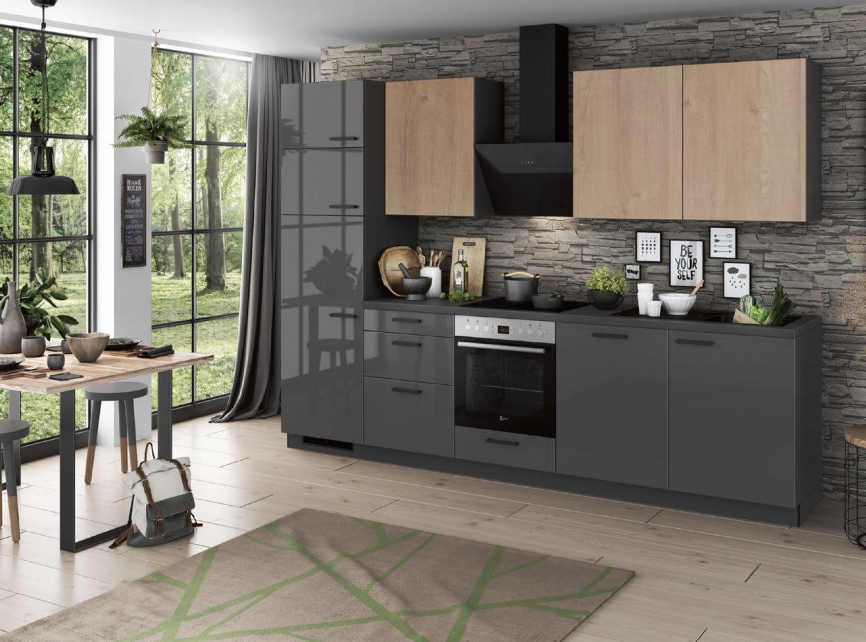 Eco ca. 300 cm breit, Front: Graphit Lack hochglänzend/Sherwood Toffee Nachbildung, Korpus: Graphit, Geräte Abb. ähnlich, Geschirrspüler gegen Mehrpreis