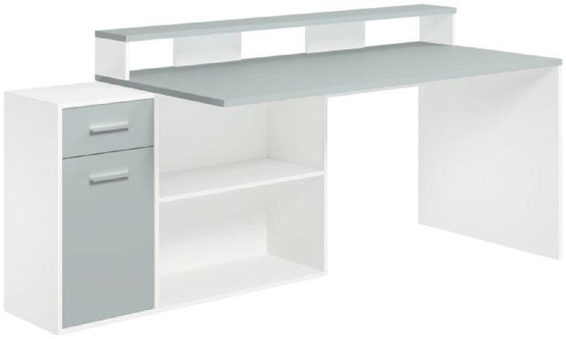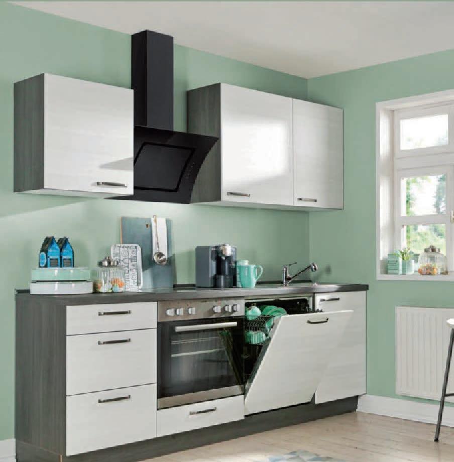 Doppelblock Star ca. 280 und 150 cm, Front: hellgrau Hochglanz, Korpus: Eiche grau Nachbildung, Geräte-Abb. ähnlich, Geschirrspüler gegen