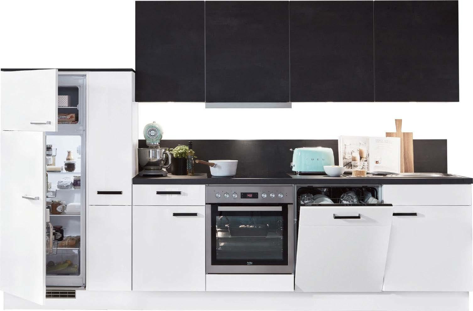 Küchenblock Flash ca. 320 cm breit, Front: Alpinweiß Hochglanz/Schwarzbeton, Korpus: Alpinweiß Glanz, Geräte-Abb. ähnlich, Nischenrückwand und