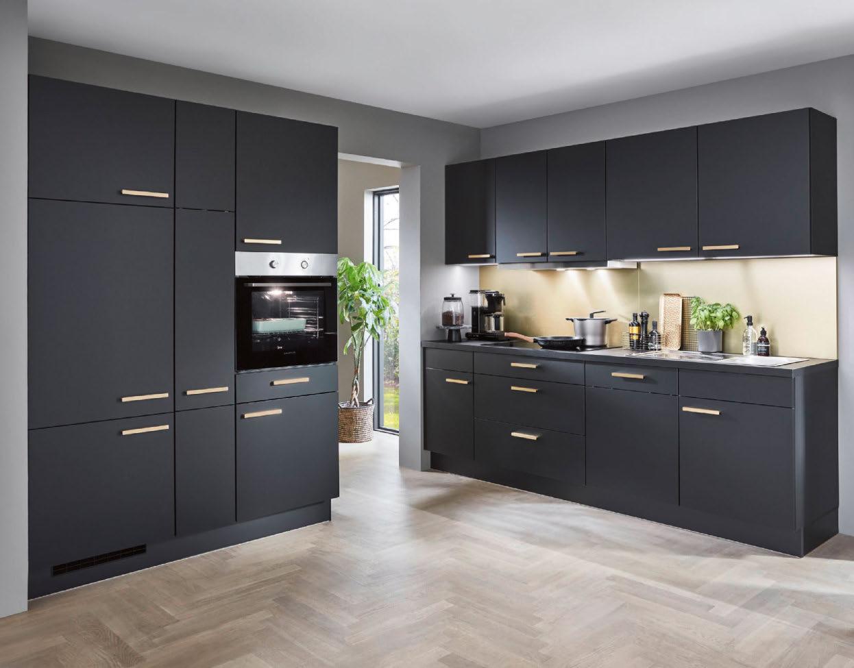 ca. 150 und 260 cm, Front: Lacklaminat, Schwarz supermatt, Korpus: Schiefergrau, Absetzungen in Gold Optik, Geräte-Abb. ähnlich, Beleuchtung, Nischenrückwand und Geschirrspüler gegen Mehrpreis