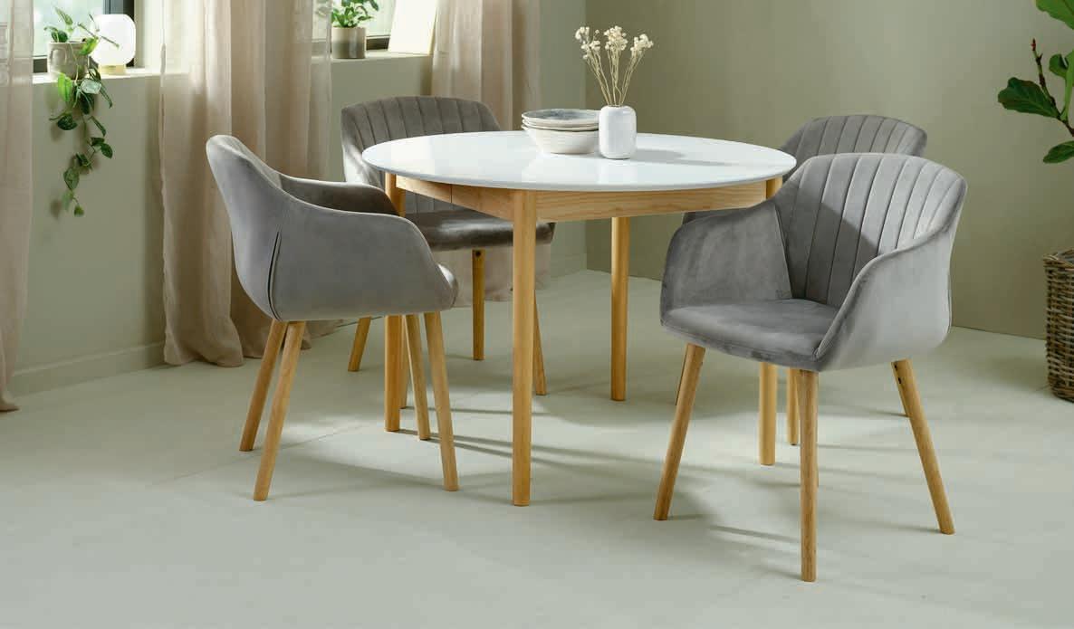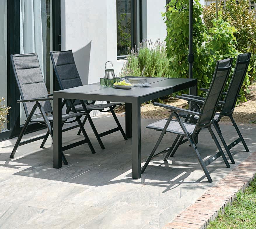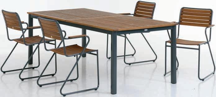 Маса: Алуминий, стомана и изкуствена дървесина. Вкл. 1 крило. Ш120 x Д120/170 x В75 см. Стол: Алуминий и UV-защитена пластмаса. Стифиращ. Маса 1099 лв 750 лв Стол 199 лв 150 лв