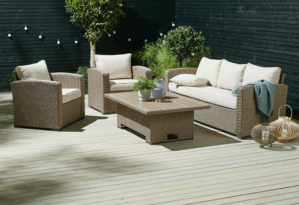 VEMB КОМПЛЕКТ МЕБЕЛИ Маса: Алуминий, изкуствена дървесина и ПВЦ ратан. С регулируема височина. Ш85 x Д134 x В45/68 см. 3-местен диван и стол: Алуминий и ПВЦ ратан. Вкл. много дебели луксозни възглавници с издръжливи