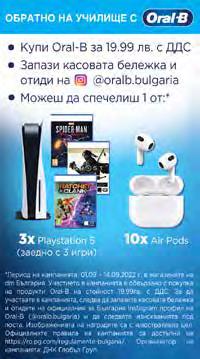 Aquafresh Детска вода за уста Big teeth, 300 ml 459лв. Неувеличавана от: Dontodent01.07.2020 СтикчетаJunior с конец за зъби, 32 бр. 279лв. Неувеличавана от: 21.04.2022 Oral-B* Накрайници Spiderman,четкаелектрическазаRefillKids4бр. 3490лв. Oral-B ЧеткаKids за зъби, от 3 5 г. или от 6 12 г., 1 бр. 359лв. Неувеличавана от: 23.07.2020 Dontodent часовник,Пясъчен 1 бр. 229лв. Неувеличавана от: 03.02.2022 SPLAT ПастаKids за Cream,илиStrawberry-Cherryзъби,FruitIce50ml 759лв. Неувеличавана от: nordics08.04.2022 Четка за зъби Premium Baby, 1 бр. 529лв. Неувеличавана от: 29.05.2022 Oral-B* 1 бр.XVtalityЧеткаЕлектрическазазъбиProProtectCleanBlack, 5990лв. PHILIPS* 1 бр.четкаелектрическаДетскаForsonicareKidsзвуковазазъби, 7990лв. Неувеличавана от: 18.06.2021 *Само в избрани dm магазини. КРАСИВА УСМИВКА