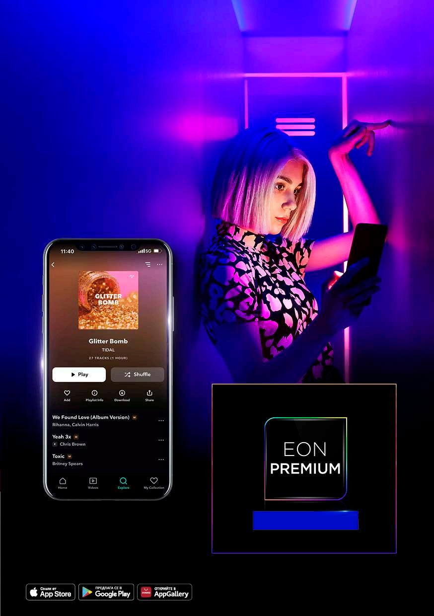 90+ НАСпеснимилионаHiFiКАЧЕСТВОЗВУКАВключенабонаментзаTIDAL HiFi към EON PREMIUM за 24 мес. Абонамент от 8.99 лв./мес. с ДДС след изтичане срока на договора. Всички цени в брошурта са в лв. с ДДС. Vivacom не носи отговорност за грешки при печат. Повече на vivacom.bg. Валидността на брошурата е до 30.09.2022 г. МУЗИКАЛНА СТРИЙМИНГ ПЛАТФОРМА ВКЛЮЧЕН В ПАКЕТ 4 месеца 1 лев на месец